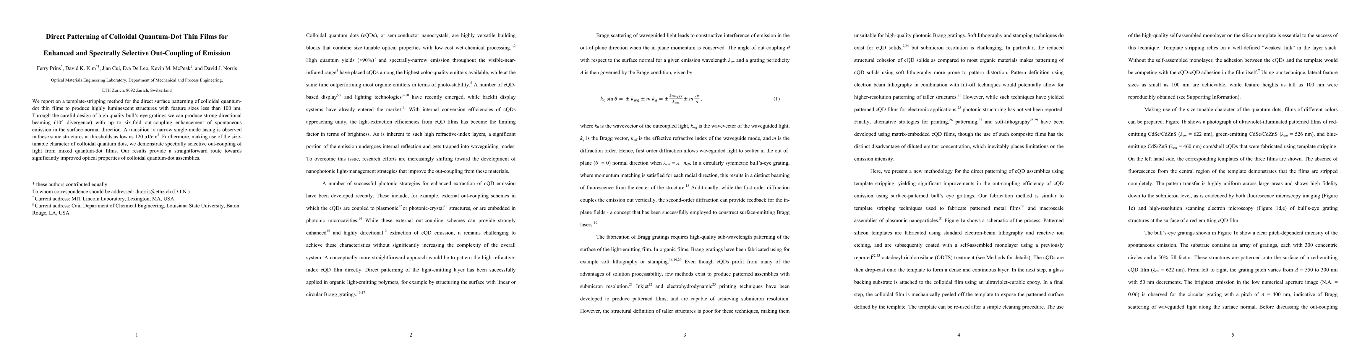 This paper presents a template-stripping method for creating highly luminescent, patterned colloidal quantum-dot thin films with sub-100 nm features, achieving up to six-fold enhancement in directional emission and low-threshold single-mode lasing. The study also demonstrates spectrally selective out-coupling of light from mixed quantum-dot films.