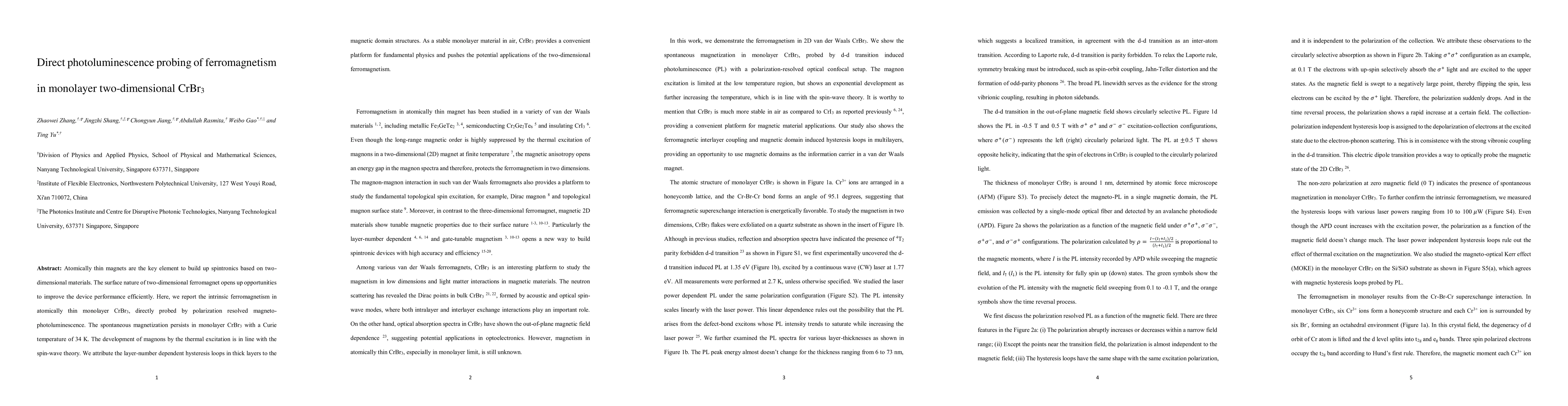 The research demonstrates intrinsic ferromagnetism in monolayer CrBr3, confirmed through polarization resolved magneto-photoluminescence. The material exhibits spontaneous magnetization at 34K, with hysteresis loops in thicker layers attributed to magnetic domains, positioning CrBr3 as a stable platform for 2D ferromagnetism studies and applications.