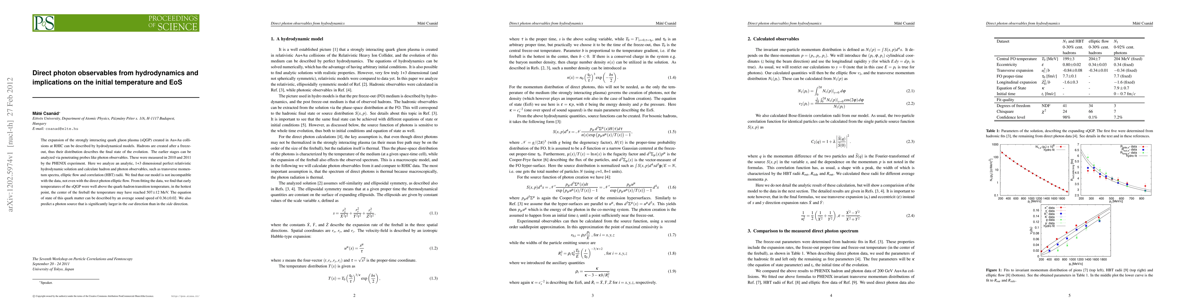 The expansion of the strongly interacting quark gluon plasma (sQGP) created in Au+Au collisions at RHIC can be described by hydrodynamical models. Hadrons are created after a freeze-out, thus their distribution describes the final state of the evolution. The earlier stages can be analyzed via penetrating probes like photon observables. These were measured in 2010 and 2011 by the PHENIX experiment. Here we analyze an analytic, 1+3 dimensional perfect relativistic hydrodynamic solution and calculate hadron and photon observables, such as transverse momentum spectra, elliptic flow and correlation (HBT) radii. We find that our model is not incompatible with the data, not even with the direct photon elliptic flow. From fitting the data, we find that early temperatures of the sQGP were well above the quark-hadron transition temperature, in the hottest point, the center of the fireball the temperature may have reached 507+-12 MeV. The equation of state of this quark matter can be described by an average sound speed of 0.36+-0.02. We also predict a photon source that is significantly larger in the out direction than in the side direction.