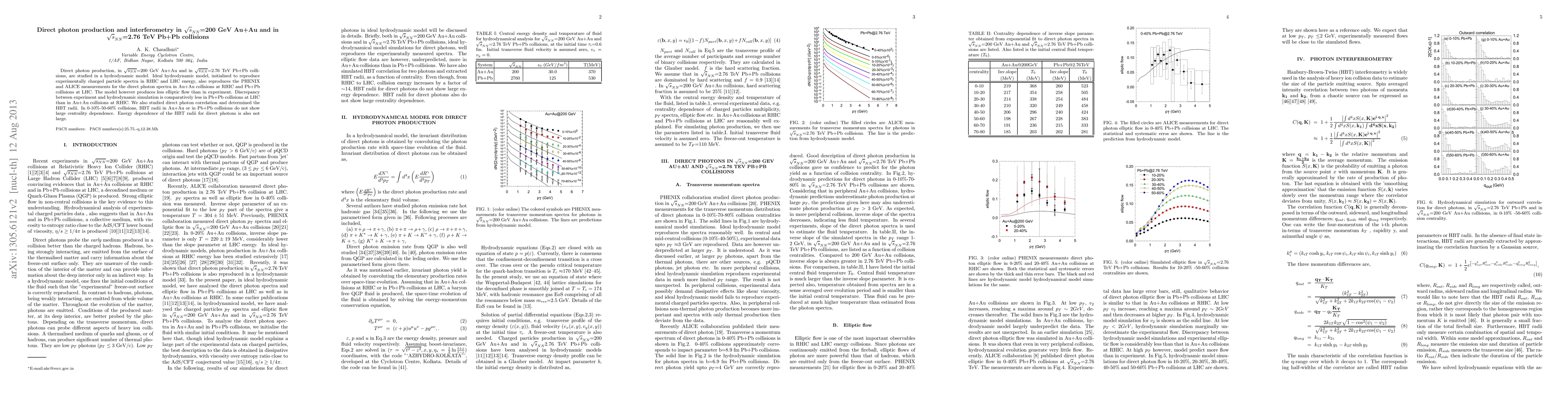 Direct photon production, in $\sqrt{s_{NN}}$=200 GeV Au+Au and in $\sqrt{s_{NN}}$=2.76 TeV Pb+Pb collisions, are studied in a hydrodynamic model. Ideal hydrodynamic model, initialised to reproduce experimentally charged particle spectra in RHIC and LHC energy, also reproduces the PHENIX and ALICE measurements for the direct photon spectra in Au+Au collisions at RHIC and Pb+Pb collisions at LHC. The model however produces less elliptic flow than in experiment. Discrepancy between experiment and hydrodynamic simulation is comparatively less in Pb+Pb collisions at LHC than in Au+Au collisions at RHIC. We also studied direct photon correlation and determined the HBT radii. In 0-10%-50-60% collisions, HBT radii in Au+Au or in Pb+Pb collisions do not show large centrality dependence. Energy dependence of the HBT radii for direct photons is also not large.