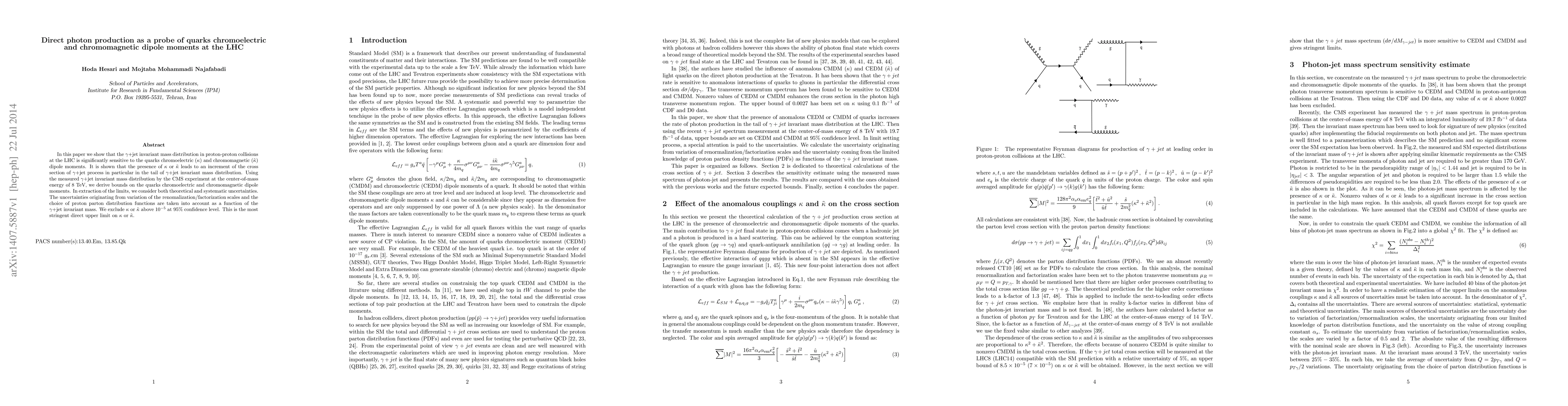 This paper investigates the $\gamma+$jet invariant mass distribution in LHC proton-proton collisions to probe quarks' chromoelectric and chromomagnetic dipole moments. It finds that these moments lead to an increased cross-section in the tail of the $\gamma+$jet invariant mass distribution, deriving the most stringent direct upper limit of $10^{-5}$ at 95% confidence level.