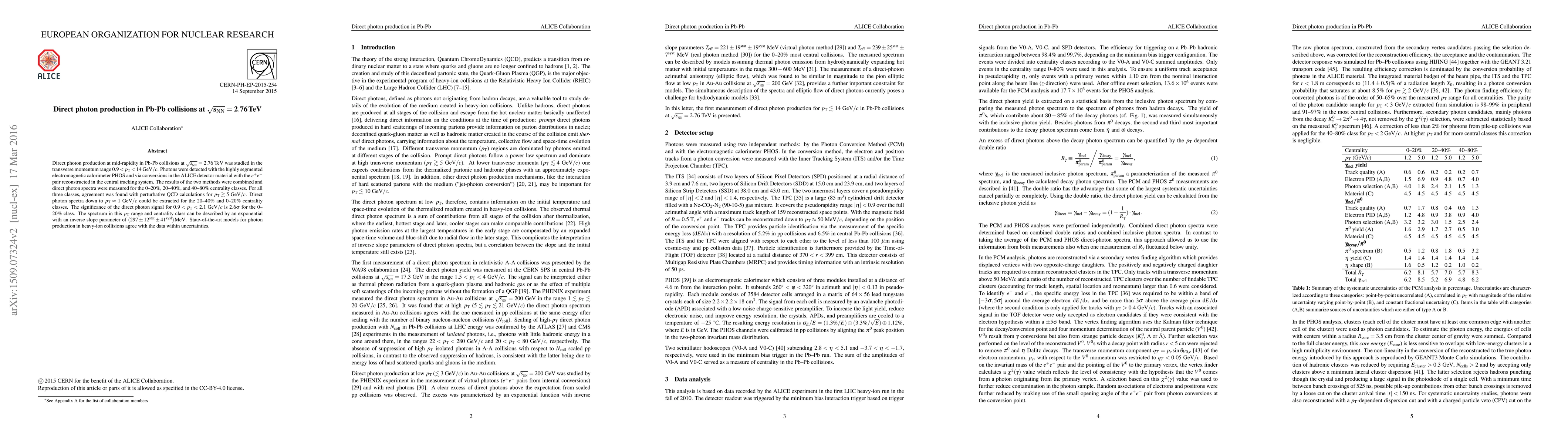 This study investigates direct photon production in Pb-Pb collisions at $\sqrt{s_{_{\mathrm{NN}}}} = 2.76$ TeV, revealing agreement with perturbative QCD calculations for high transverse momentum. The direct photon spectra show a significant signal at low $p_\mathrm{T}$ and are well described by an exponential function.