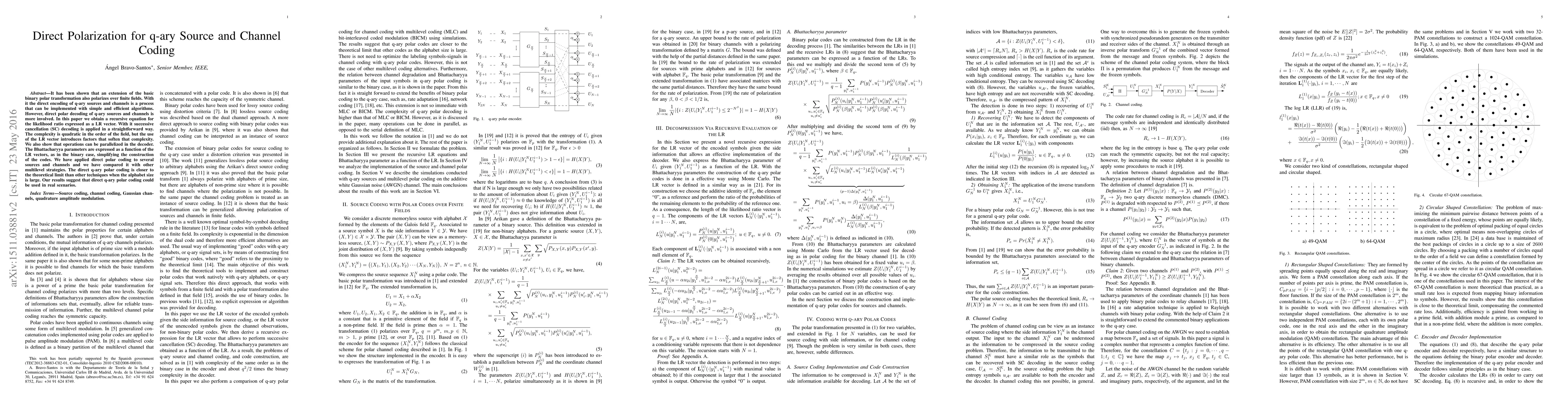 It has been shown that an extension of the basic binary polar transformation also polarizes over finite fields. With it the direct encoding of q-ary sources and channels is a process that can be implemented with simple and efficient algorithms. However, direct polar decoding of q-ary sources and channels is more involved. In this paper we obtain a recursive equation for the likelihood ratio expressed as a LR vector. With it successive cancellation (SC) decoding is applied in a straightforward way. The complexity is quadratic in the order of the field, but the use of the LR vector introduces factors that soften that complexity. We also show that operations can be parallelized in the decoder. The Bhattacharyya parameters are expressed as a function of the LR vectors, as in the binary case, simplifying the construction of the codes. We have applied direct polar coding to several sources and channels and we have compared it with other multilevel strategies. The direct q-ary polar coding is closer to the theoretical limit than other techniques when the alphabet size is large. Our results suggest that direct q-ary polar coding could be used in real scenarios.