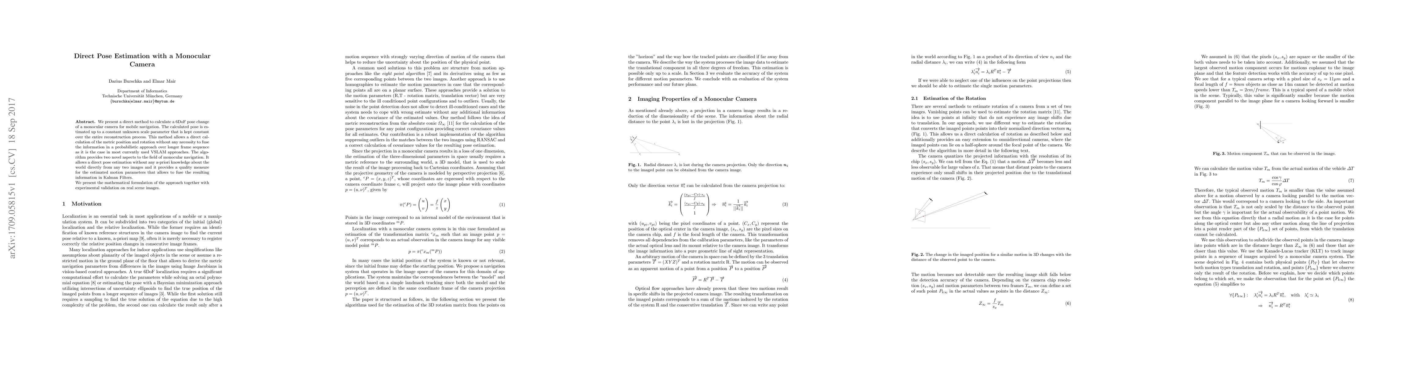 We present a direct method to calculate a 6DoF pose change of a monocular camera for mobile navigation. The calculated pose is estimated up to a constant unknown scale parameter that is kept constant over the entire reconstruction process. This method allows a direct cal- culation of the metric position and rotation without any necessity to fuse the information in a probabilistic approach over longer frame sequence as it is the case in most currently used VSLAM approaches. The algorithm provides two novel aspects to the field of monocular navigation. It allows a direct pose estimation without any a-priori knowledge about the world directly from any two images and it provides a quality measure for the estimated motion parameters that allows to fuse the resulting information in Kalman Filters. We present the mathematical formulation of the approach together with experimental validation on real scene images.