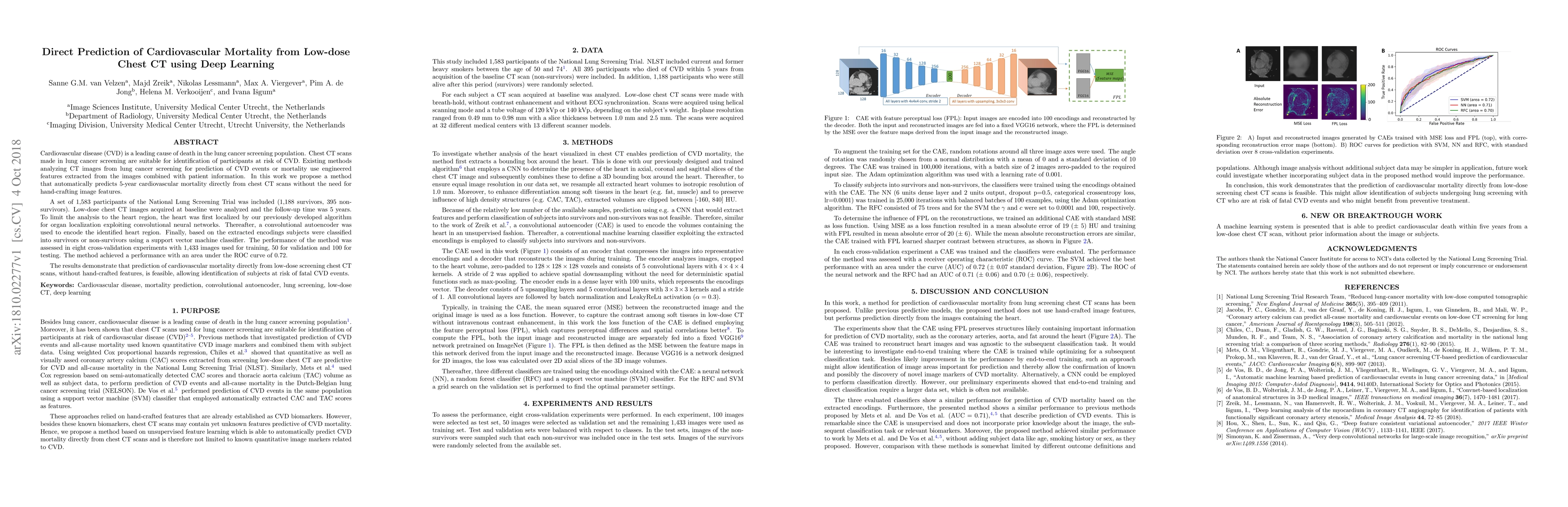 This study proposes a deep learning method to directly predict 5-year cardiovascular mortality from low-dose chest CT scans without hand-crafted features, using a convolutional autoencoder and support vector machine classifier. The method achieved an AUC of 0.72 in cross-validation, demonstrating its feasibility for identifying high-risk individuals in lung cancer screening.