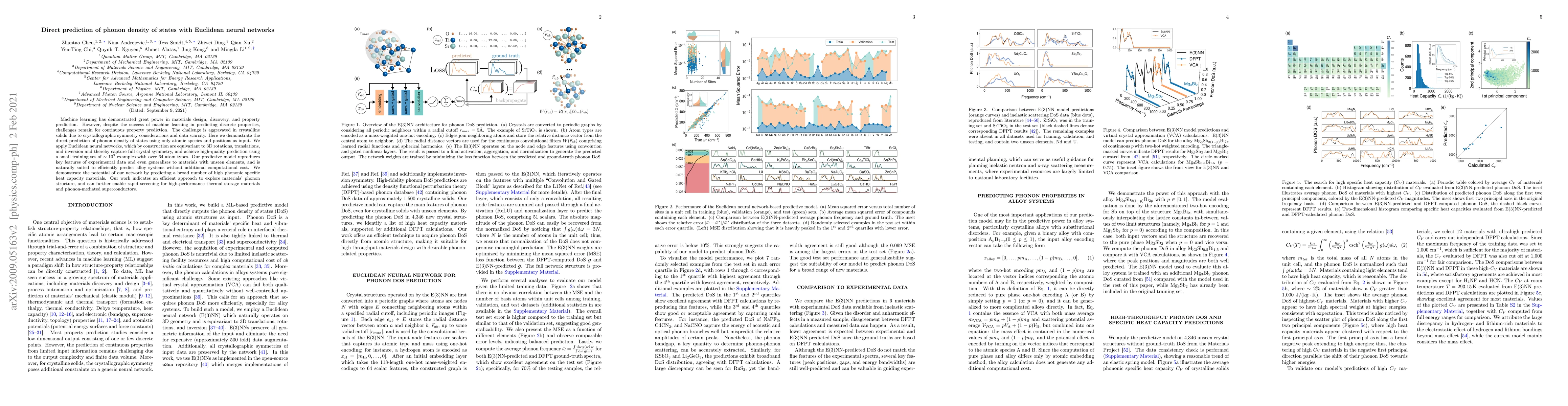 Machine learning has demonstrated great power in materials design, discovery, and property prediction. However, despite the success of machine learning in predicting discrete properties, challenges remain for continuous property prediction. The challenge is aggravated in crystalline solids due to crystallographic symmetry considerations and data scarcity. Here we demonstrate the direct prediction of phonon density of states using only atomic species and positions as input. We apply Euclidean neural networks, which by construction are equivariant to 3D rotations, translations, and inversion and thereby capture full crystal symmetry, and achieve high-quality prediction using a small training set of $\sim 10^{3}$ examples with over 64 atom types. Our predictive model reproduces key features of experimental data and even generalizes to materials with unseen elements,and is naturally suited to efficiently predict alloy systems without additional computational cost. We demonstrate the potential of our network by predicting a broad number of high phononic specific heat capacity materials. Our work indicates an efficient approach to explore materials' phonon structure, and can further enable rapid screening for high-performance thermal storage materials and phonon-mediated superconductors.