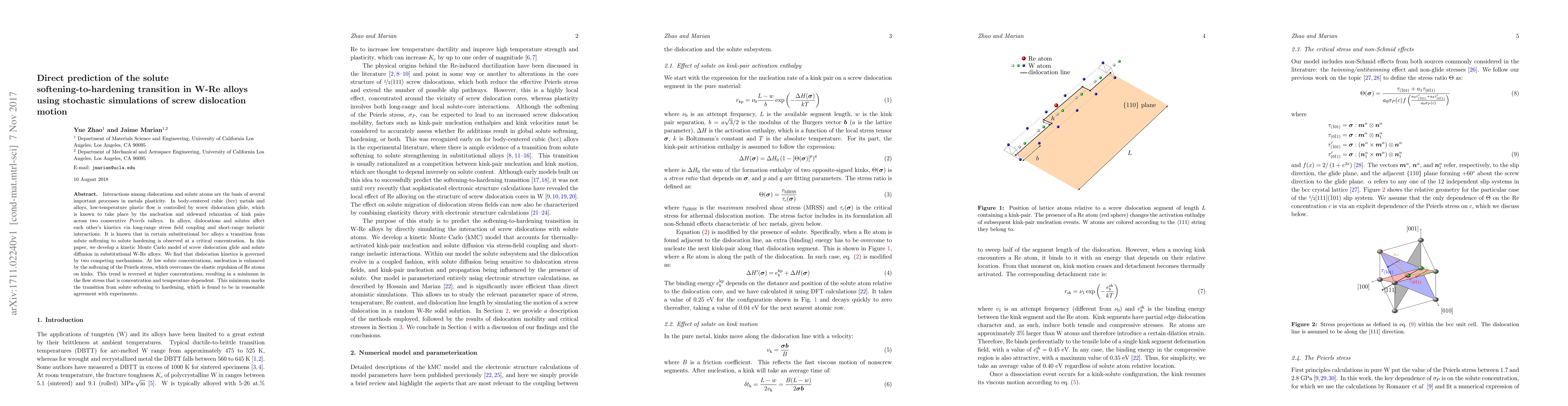 This paper develops a kinetic Monte Carlo model to simulate screw dislocation motion in W-Re alloys, revealing a transition from solute softening to hardening at a critical concentration due to competing dislocation nucleation and elastic repulsion mechanisms. The model's predictions align well with experimental observations.