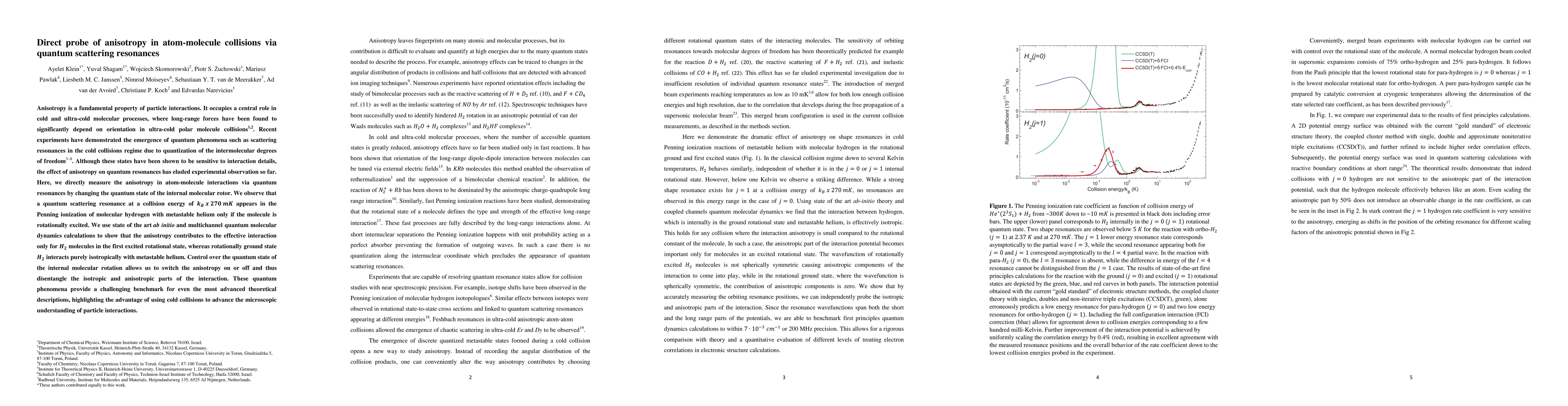 This paper reports the direct measurement of anisotropy in atom-molecule collisions via quantum scattering resonances, demonstrating that rotationally excited $H_2$ molecules exhibit anisotropic interactions with metastable helium, while ground state $H_2$ shows purely isotropic behavior. The findings provide a benchmark for advanced theoretical models and underscore the potential of cold collisions to enhance our understanding of particle interactions.
