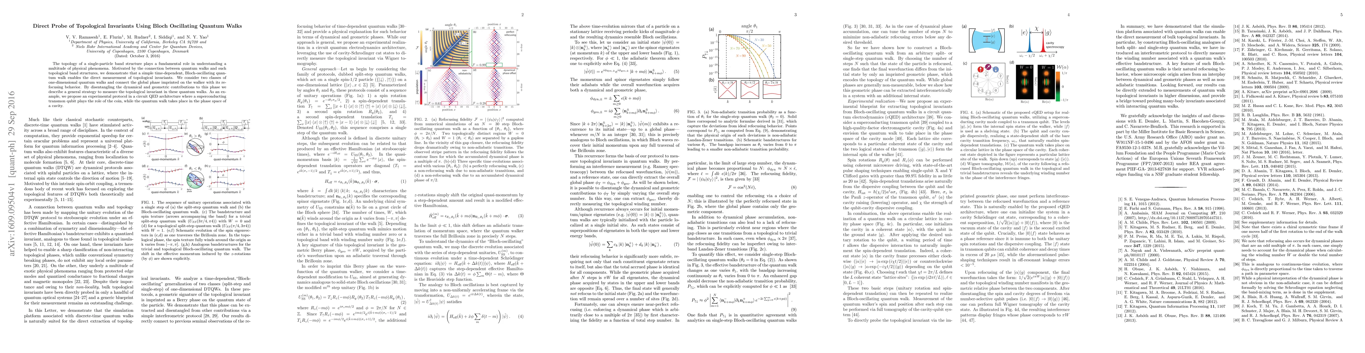 This paper demonstrates the direct measurement of topological invariants using Bloch-oscillating quantum walks, showing how the global phase imprinted on the walker correlates with its refocusing behavior. An experimental protocol is proposed for a circuit QED architecture utilizing a superconducting transmon qubit and a cavity.
