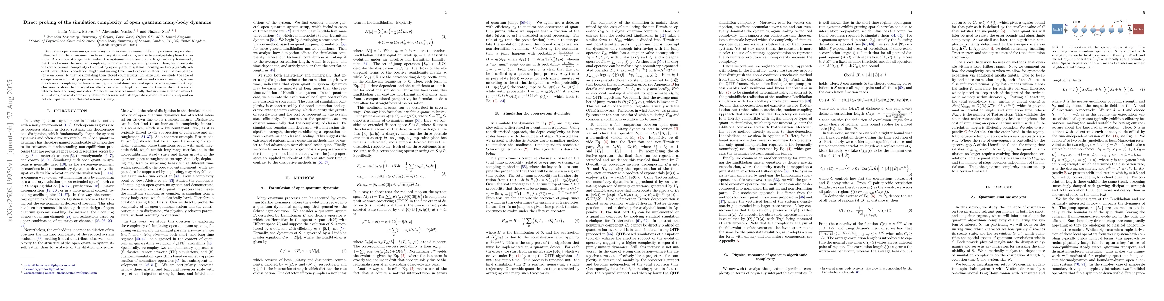 Simulating open quantum systems is key to understanding non-equilibrium processes, as persistent influence from the environment induces dissipation and can give rise to steady-state phase transitions. A common strategy is to embed the system-environment into a larger unitary framework, but this obscures the intrinsic complexity of the reduced system dynamics. Here, we investigate the computational complexity of simulating open quantum systems, focusing on two physically relevant parameters, correlation length and mixing time, and explore whether it can be comparable (or even lower) to that of simulating their closed counterparts. In particular, we study the role of dissipation in simulating open-system dynamics using both quantum and classical methods, where the classical complexity is characterised by the bond dimension and operator entanglement entropy. Our results show that dissipation affects correlation length and mixing time in distinct ways at intermediate and long timescales. Moreover, we observe numerically that in classical tensor network simulations, classical complexity does not decrease with stronger dissipation, revealing a separation between quantum and classical resource scaling.