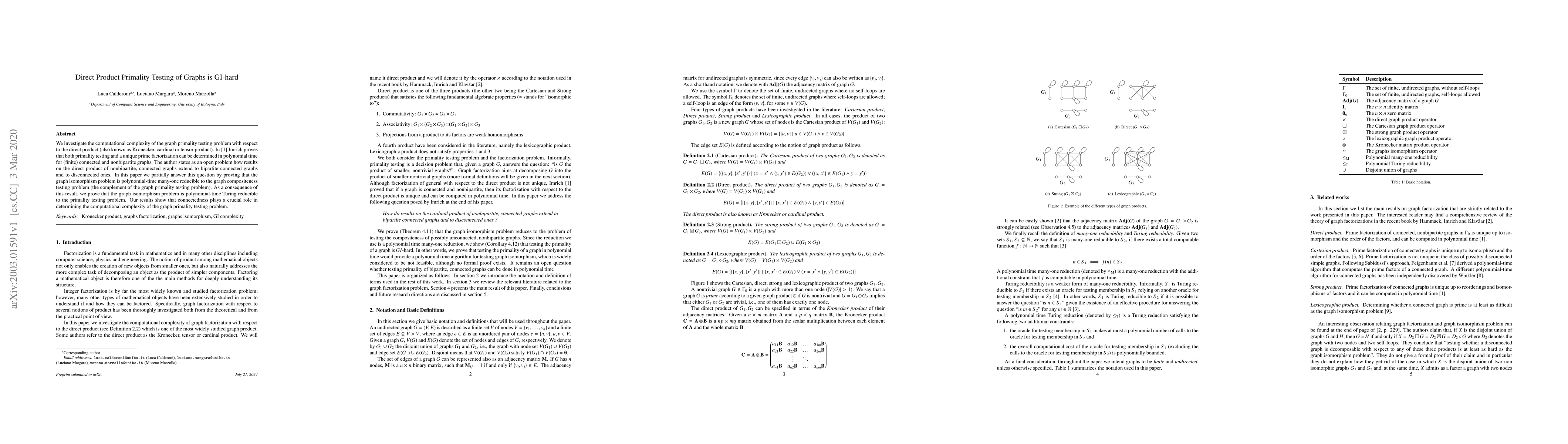The graph primality testing problem is GI-hard for direct product graphs, meaning that determining graph isomorphism is at least as hard as solving the primality test, with implications for understanding computational complexity in graph theory.