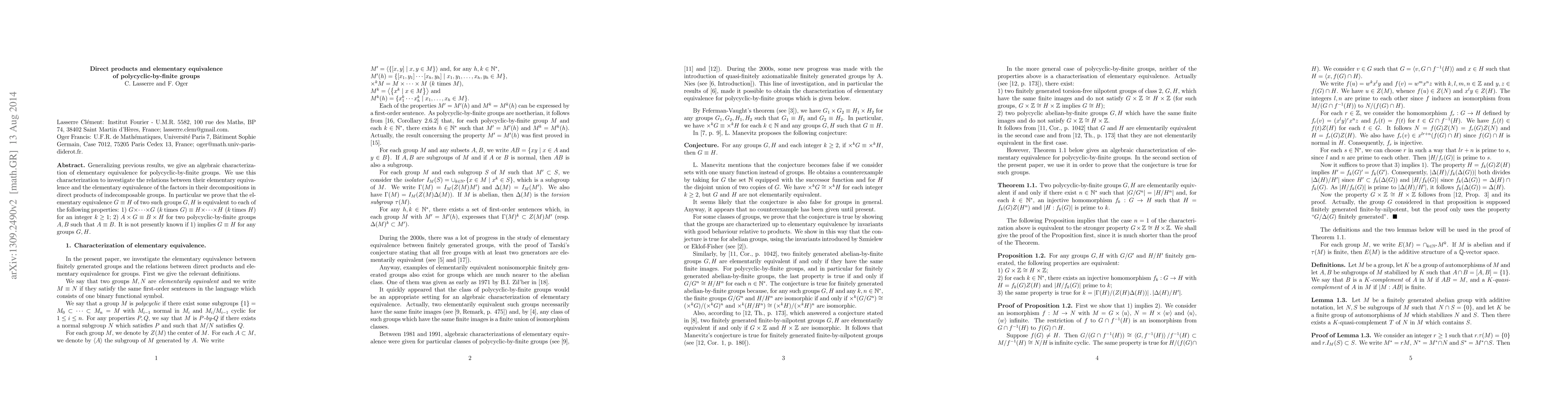 This paper provides an algebraic framework to understand elementary equivalence in polycyclic-by-finite groups and explores how it relates to direct product decompositions. The key finding is that two such groups are elementarily equivalent if specific conditions on their direct products hold, but it remains unclear if these conditions alone guarantee equivalence.