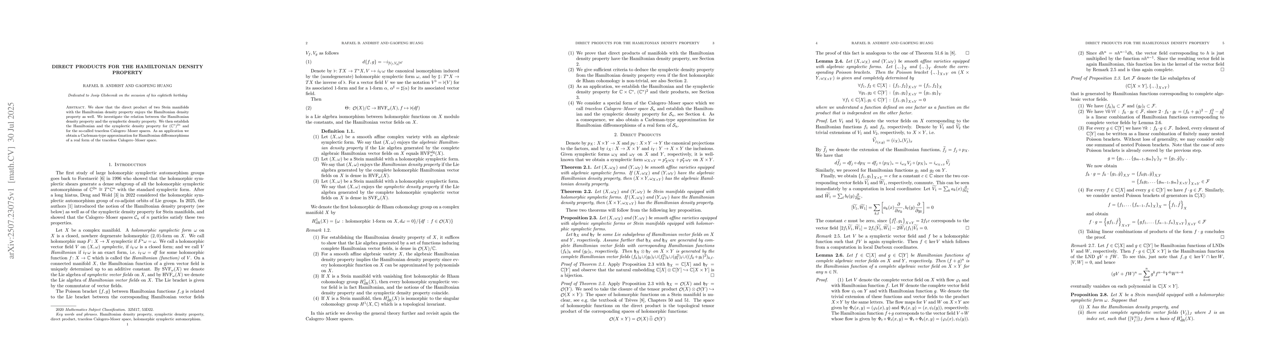 We show that the direct product of two Stein manifolds with the Hamiltonian density property enjoys the Hamiltonian density property as well. We investigate the relation between the Hamiltonian density property and the symplectic density property. We then establish the Hamiltonian and the symplectic density property for $(\mathbb{C}^\ast)^{2n}$ and for the so-called traceless Calogero--Moser spaces. As an application we obtain a Carleman-type approximation for Hamiltonian diffeomorphisms of a real form of the traceless Calogero--Moser space.