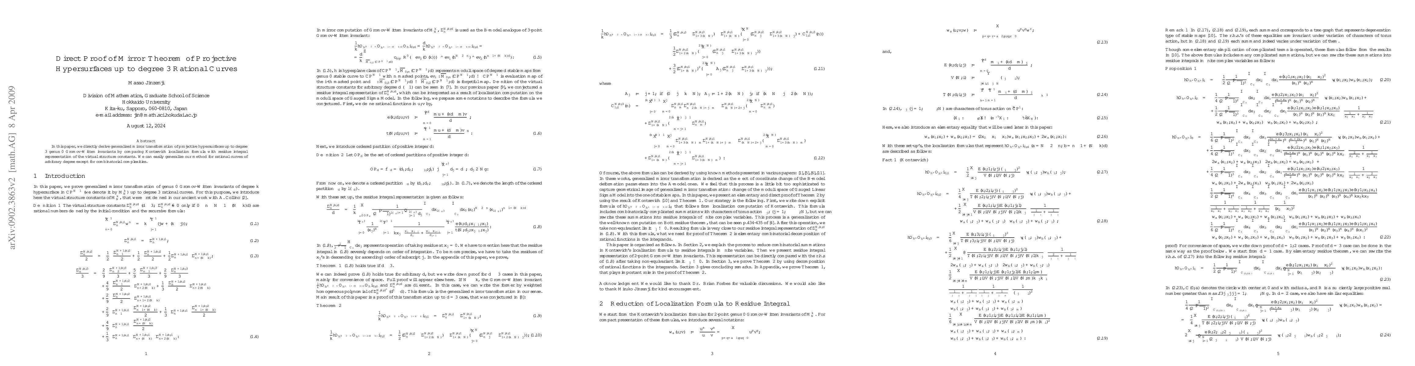 Summary: This paper provides a direct proof of the Mirror Theorem for projective hypersurfaces up to degree 3 by linking Kontsevich localization with residue integral representations. The method can be extended to rational curves of any degree, though combinatorial challenges remain.