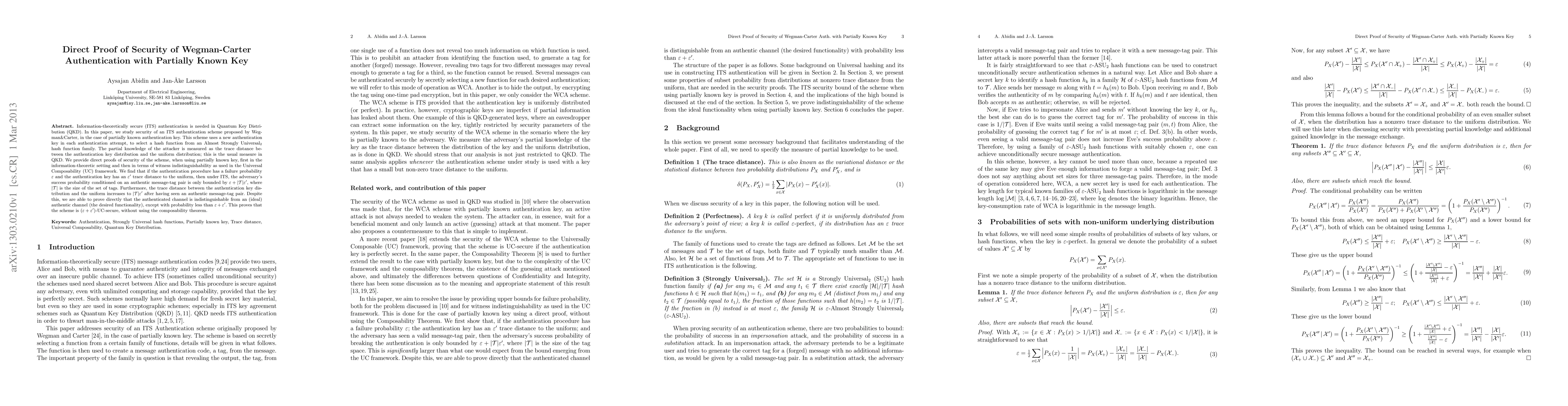 This paper provides direct proofs of the security of the Wegman-Carter authentication scheme under partially known key conditions, showing that it remains secure in the Quantum Key Distribution context. The scheme's security is demonstrated both information-theoretically and within the Universal Composability framework, proving $(\epsilon+\epsilon')$-UC-security without relying on the composability theorem.