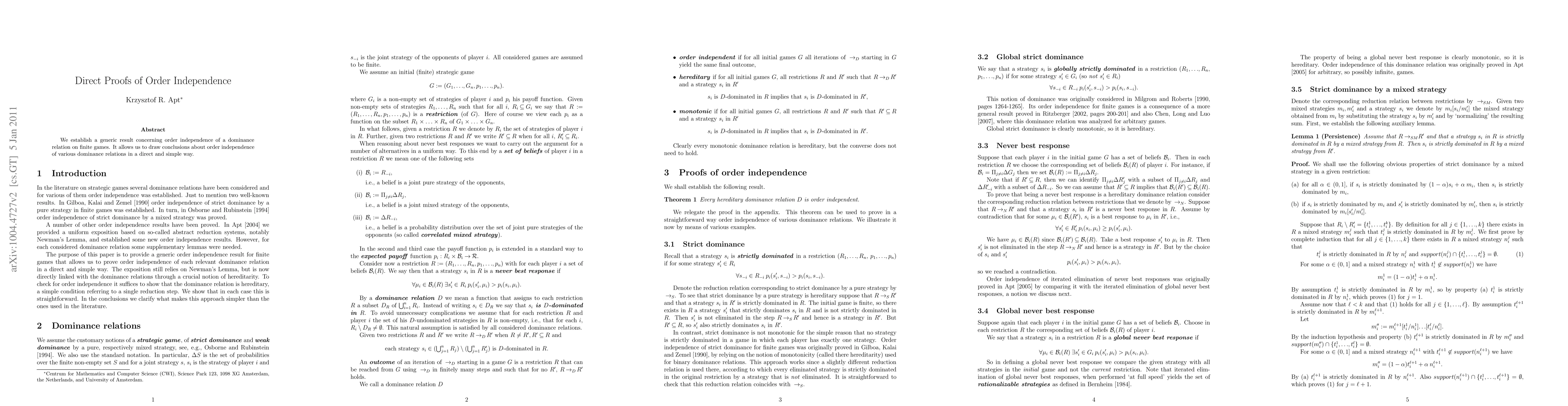 We establish a generic result concerning order independence of a dominance relation on finite games. It allows us to draw conclusions about order independence of various dominance relations in a direct and simple way.