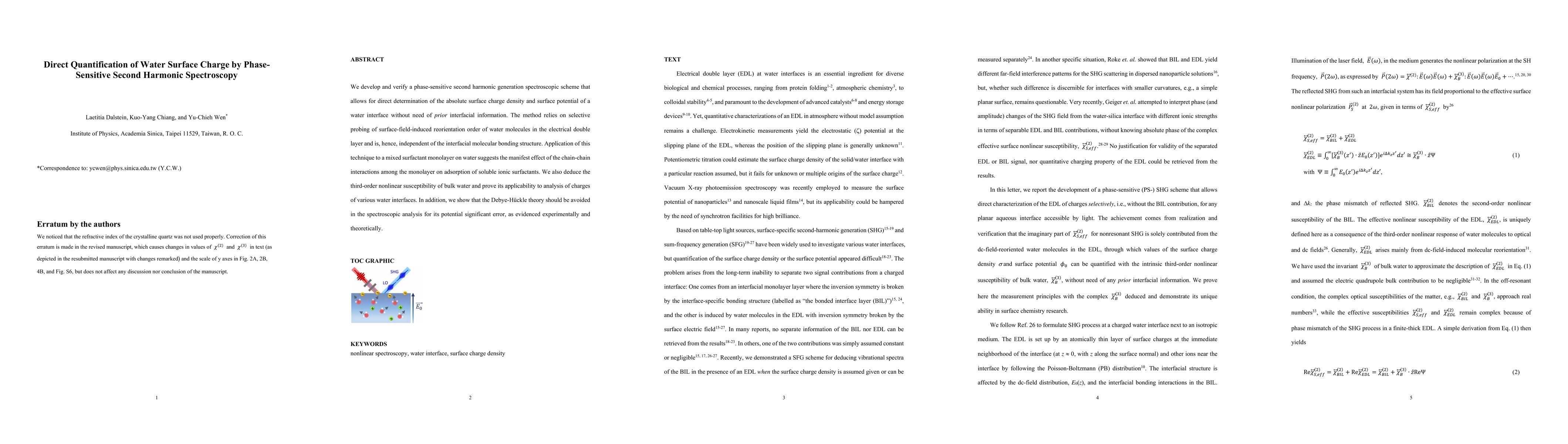 This paper introduces a novel phase-sensitive second harmonic spectroscopy method for directly quantifying water surface charge density and potential without prior interfacial information. It demonstrates the technique's application to mixed surfactant monolayers and highlights the importance of avoiding the Debye-Hückel theory in spectroscopic analyses due to potential errors.