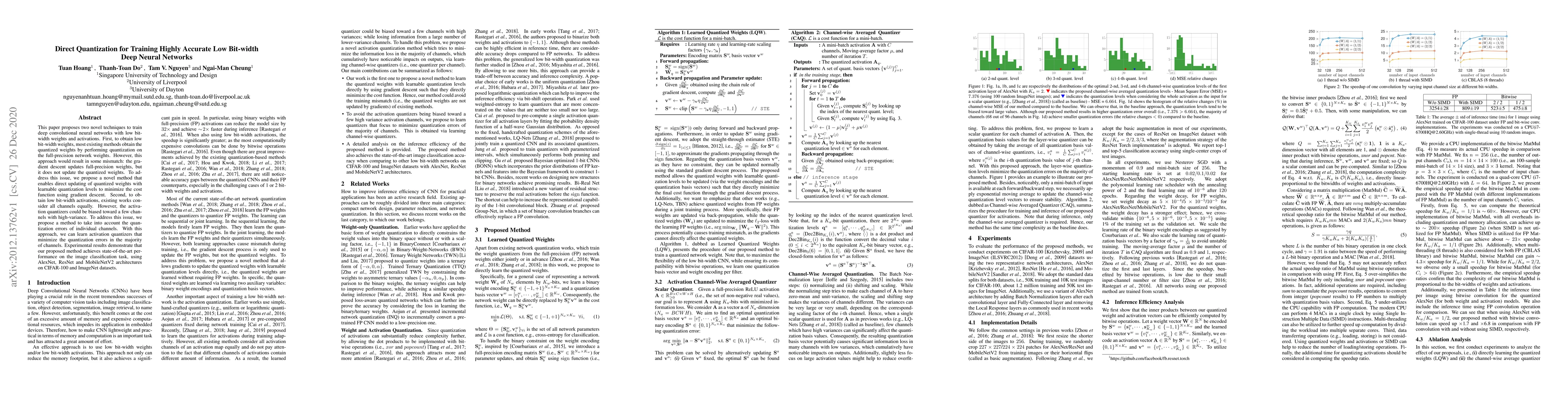 This paper proposes two novel techniques to train deep convolutional neural networks with low bit-width weights and activations. First, to obtain low bit-width weights, most existing methods obtain the quantized weights by performing quantization on the full-precision network weights. However, this approach would result in some mismatch: the gradient descent updates full-precision weights, but it does not update the quantized weights. To address this issue, we propose a novel method that enables {direct} updating of quantized weights {with learnable quantization levels} to minimize the cost function using gradient descent. Second, to obtain low bit-width activations, existing works consider all channels equally. However, the activation quantizers could be biased toward a few channels with high-variance. To address this issue, we propose a method to take into account the quantization errors of individual channels. With this approach, we can learn activation quantizers that minimize the quantization errors in the majority of channels. Experimental results demonstrate that our proposed method achieves state-of-the-art performance on the image classification task, using AlexNet, ResNet and MobileNetV2 architectures on CIFAR-100 and ImageNet datasets.