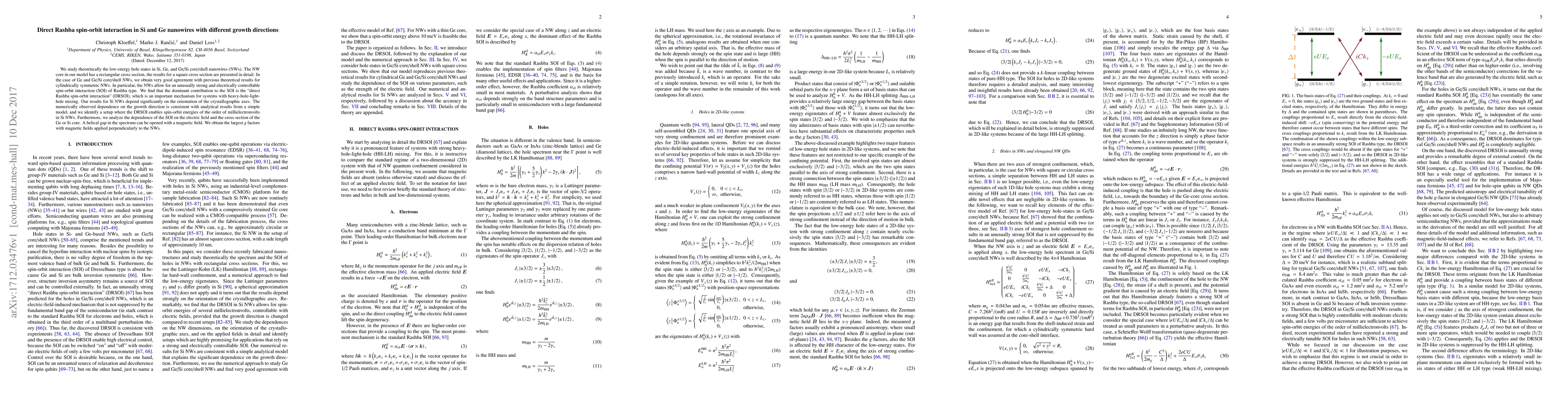 This paper theoretically investigates the low-energy hole states in Si, Ge, and Ge/Si core/shell nanowires, focusing on the strong and electrically controllable Rashba spin-orbit interaction. The study finds that the direct Rashba spin-orbit interaction is dominant, especially in Ge NWs, and that the spin-orbit energies in Si NWs depend significantly on the crystallographic orientation, with millielectronvolts achievable in certain configurations.