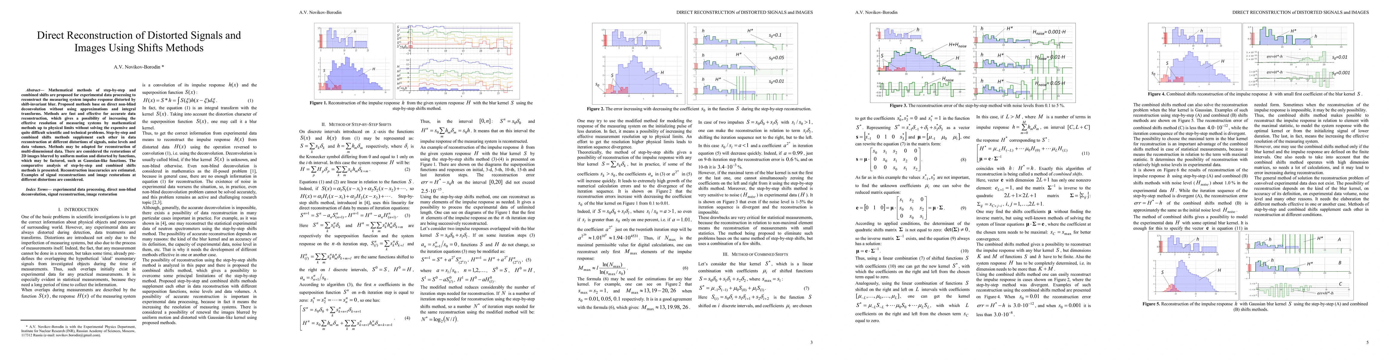 Mathematical methods of step-by-step and combined shifts are proposed for experimental data processing to reconstruct the measuring system impulse response distorted by shift-invariant blur. Proposed methods base on direct non-blind deconvolution without using approximations and integral transforms. Methods are fast and effective for accurate data reconstruction, which gives a possibility of increasing the effective resolution of measuring systems by mathematical methods up to physical limits without solving the expensive and quite difficult scientific and technical problems. Step-by-step and combined shifts methods supplement each other in data reconstruction at different distortions of signals, noise levels and data volumes. Methods may be adapted for reconstruction of multi-dimensional data. There are considered the restorations of 2D images blurred by uniform motion and distorted by functions, which may be factored, such as Gaussian-like functions. The comparative analysis of step-by-step and combined shifts methods is presented. Reconstruction inaccuracies are estimated. Examples of signal reconstructions and image restorations at different distortions are considered.