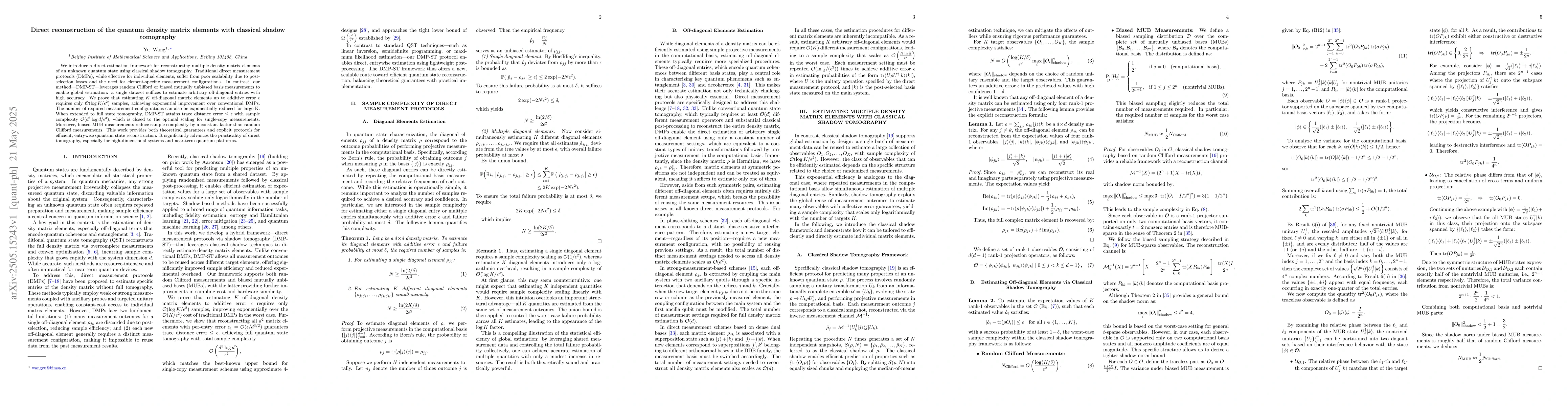 The research introduces a direct estimation framework called DMP-ST, which uses random Clifford or biased mutually unbiased basis measurements for global estimation of density matrix elements. It leverages a single dataset to estimate arbitrary off-diagonal entries with high accuracy, significantly reducing sample complexity and measurement configurations compared to traditional direct measurement protocols (DMPs).
