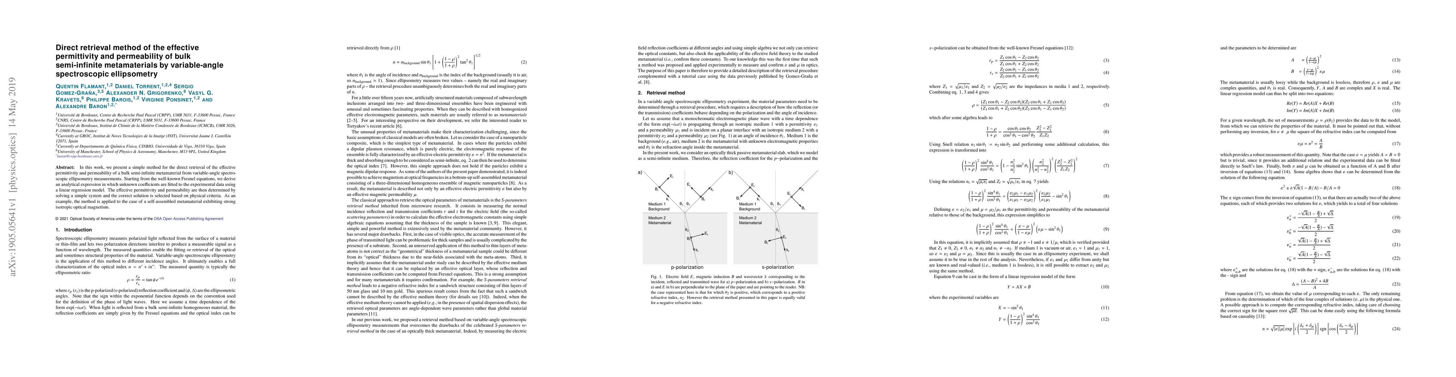 This paper introduces a straightforward method for determining the effective permittivity and permeability of bulk semi-infinite metamaterials using variable-angle spectroscopic ellipsometry. The method involves fitting unknown coefficients to experimental data via linear regression and selecting the correct solution based on physical criteria.
