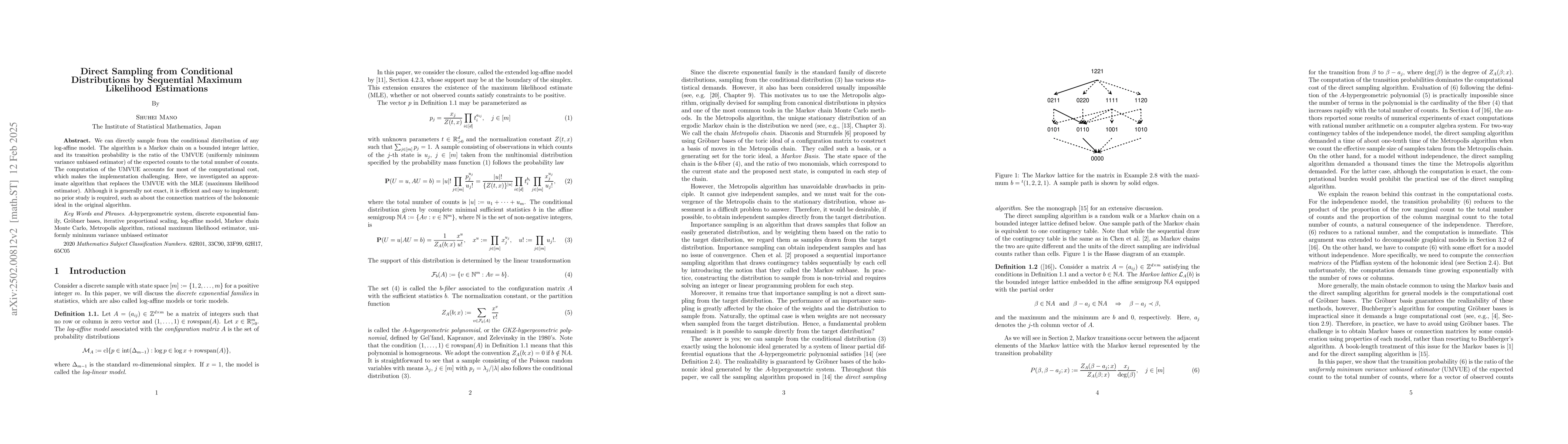 This paper proposes an efficient, approximate algorithm for direct sampling from conditional distributions in log-affine models using sequential maximum likelihood estimations instead of the computationally expensive UMVUE, simplifying implementation without prior knowledge of the original algorithm's complex structures.