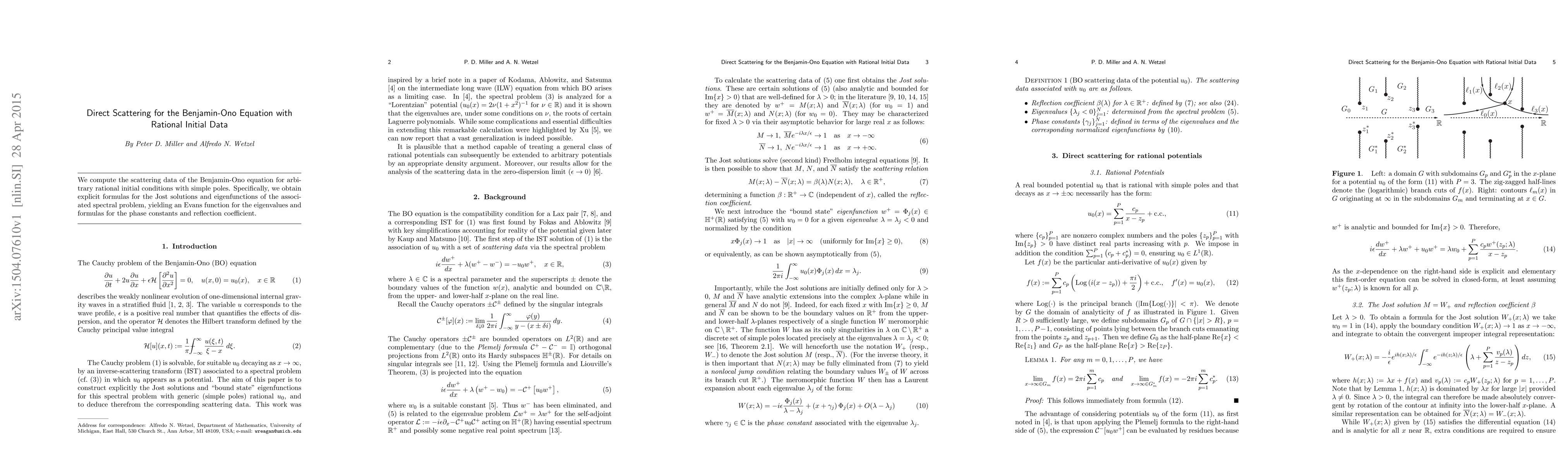 This paper provides explicit formulas for the scattering data of the Benjamin-Ono equation with rational initial conditions featuring simple poles. It derives Jost solutions, eigenfunctions, and an Evans function, along with phase constants and reflection coefficients for the spectral problem.