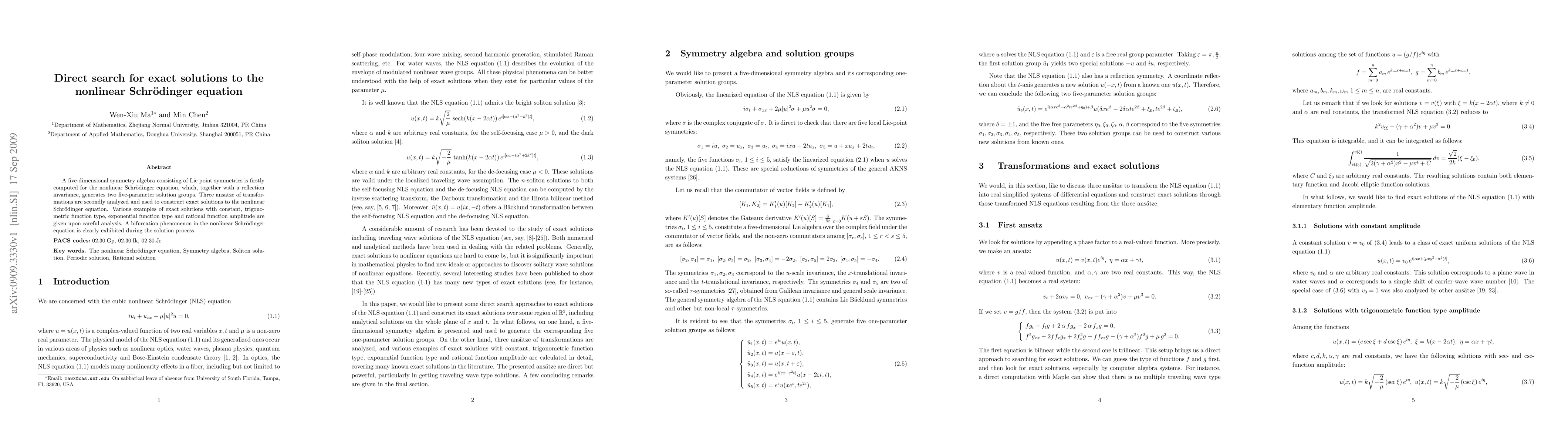 This paper identifies a five-dimensional symmetry algebra for the nonlinear Schrödinger equation, leading to two five-parameter solution groups. It then constructs exact solutions using three transformation ansätze, showcasing examples with various function types and highlighting a bifurcation phenomenon.
