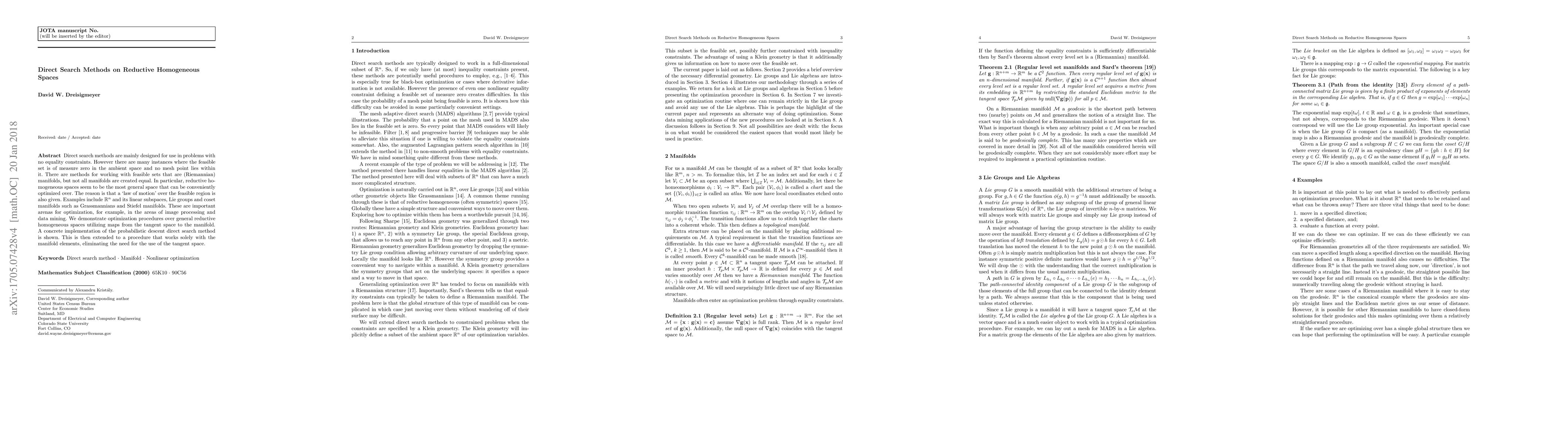 Researchers developed direct search methods for optimization on reductive homogeneous spaces, which have no feasible set with mesh points, and demonstrated a probabilistic descent method with improved performance.