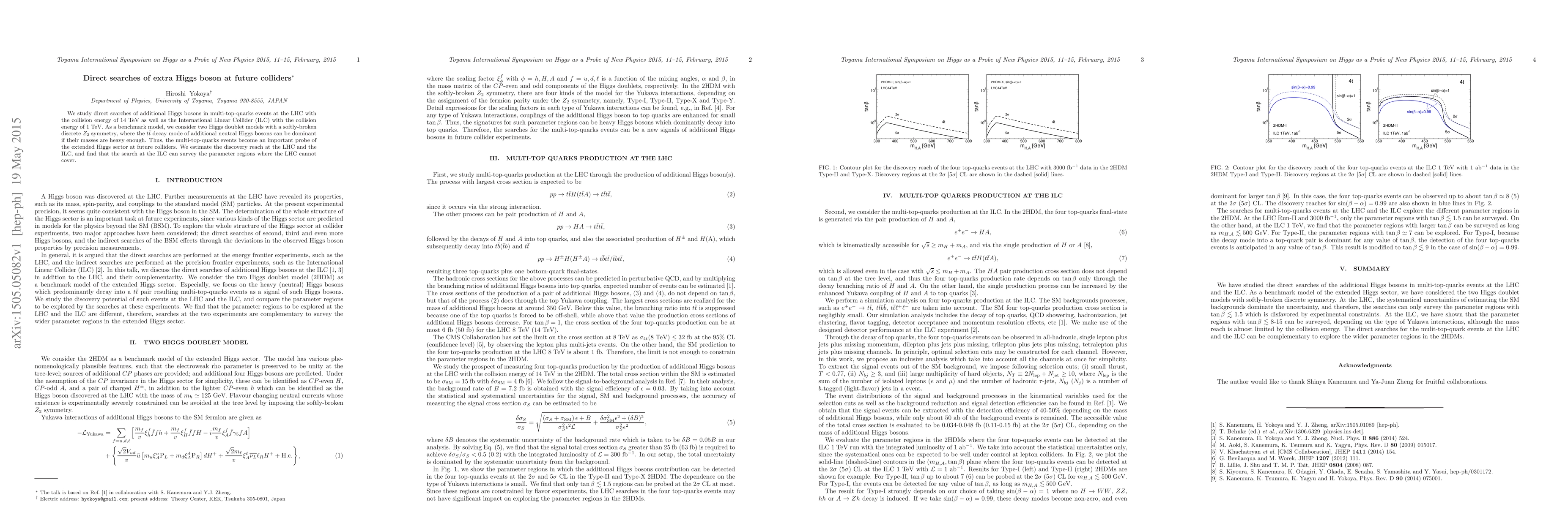 This paper investigates direct searches for extra Higgs bosons in multi-top-quark events at the LHC and ILC, focusing on two Higgs doublet models with a softly-broken $Z_2$ symmetry. The study finds that the ILC can explore parameter regions beyond the LHC's reach, particularly for heavy Higgs bosons with dominant $t\bar t$ decay modes.