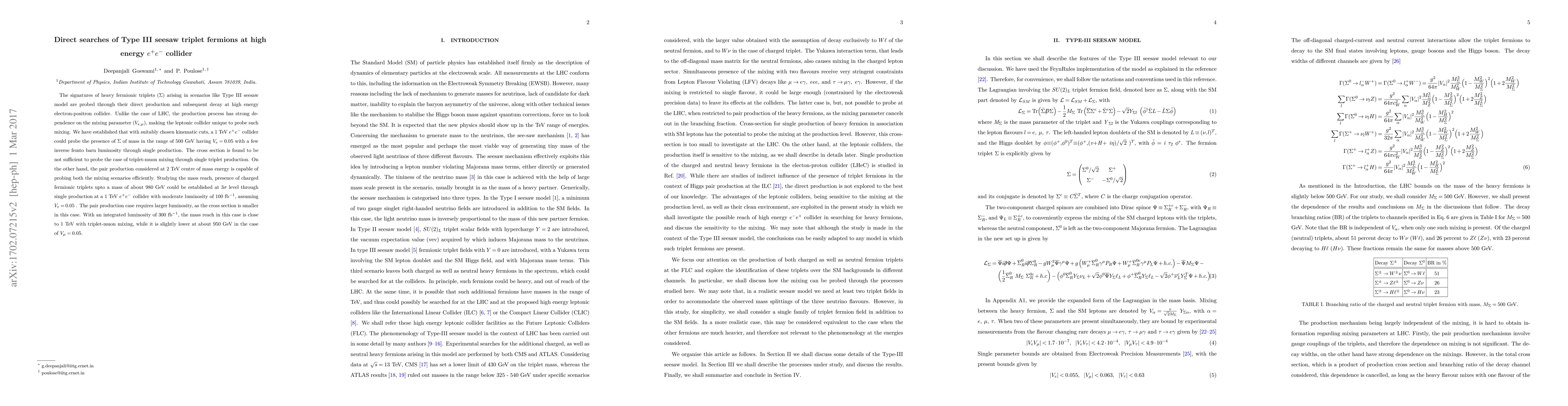 The signatures of heavy fermionic triplets ($\Sigma$) arising in scenarios like Type III seesaw model are probed through their direct production and subsequent decay at high energy electron-positron collider. Unlike the case of LHC, the production process has strong dependence on the mixing parameter ($V_{e,\mu}$), making the leptonic collider unique to probe such mixing. We have established that with suitably chosen kinematic cuts, a 1 TeV $e^+e^-$ collider could probe the presence of $\Sigma$ of mass in the range of 500 GeV having $V_e=0.05$ with a few inverse femto barn luminosity through single production. The cross section is found to be not sufficient to probe the case of triplet-muon mixing through single triplet production. On the other hand, the pair production considered at 2 TeV centre of mass energy is capable of probing both the mixing scenarios efficiently. Studying the mass reach, presence of charged fermionic triplets upto a mass of about 980 GeV could be established at $3\sigma$ level through single production at a 1 TeV $e^+e^-$ collider with moderate luminosity of 100 fb$^{-1}$, assuming $V_e = 0.05$ . The pair production case requires larger luminosity, as the cross section is smaller in this case. With an integrated luminosity of 300 fb$^{-1}$, the mass reach in this case is close to 1 TeV with triplet-muon mixing, while it is slightly lower at about 950 GeV in the case of $V_\mu = 0.05$.