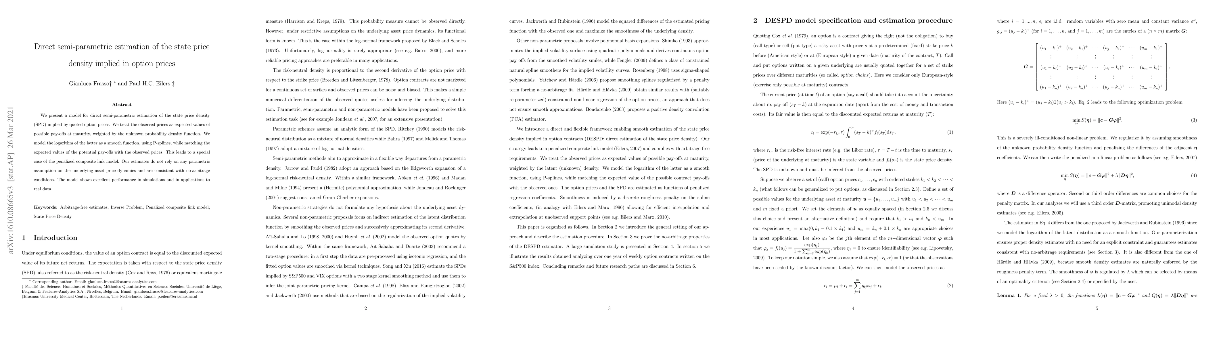 We present a model for direct semi-parametric estimation of the State Price Density (SPD) implied in quoted option prices. We treat the observed prices as expected values of possible pay-offs at maturity, weighted by the unknown probability density function. We model the logarithm of the latter as a smooth function while matching the expected values of the potential pay-offs with the observed prices. This leads to a special case of the penalized composite link model. Our estimates do not rely on any parametric assumption on the underlying asset price dynamics and are consistent with no-arbitrage conditions. The model shows excellent performance in simulations and in application to real data.