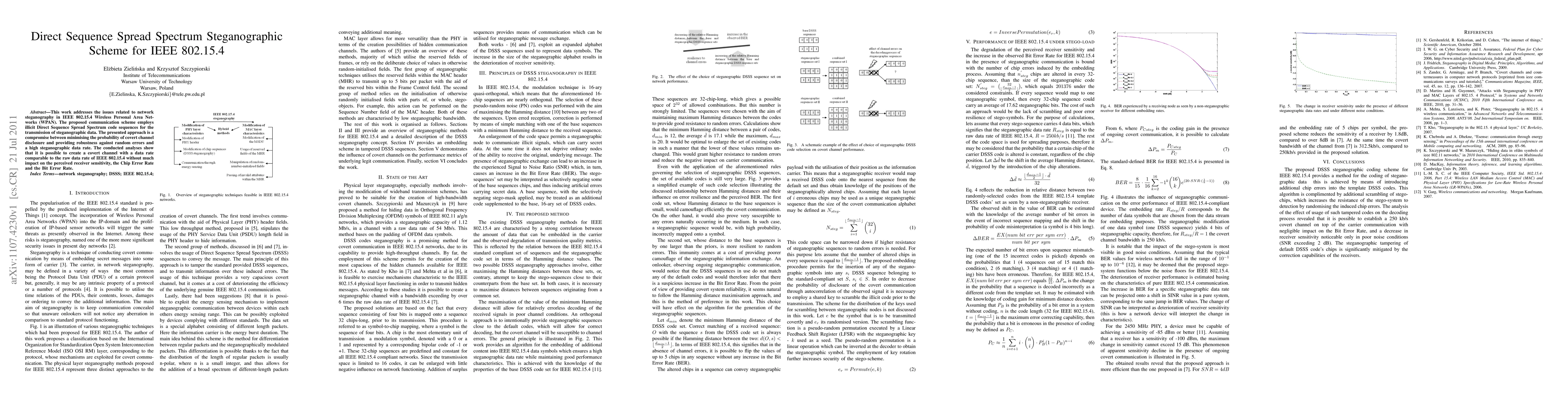 This paper proposes a Direct Sequence Spread Spectrum (DSSS) based steganographic scheme for IEEE 802.15.4 WPANs, aiming to balance covert channel security and data transmission efficiency. The scheme achieves high data rates with minimal impact on receiver sensitivity and error rates.