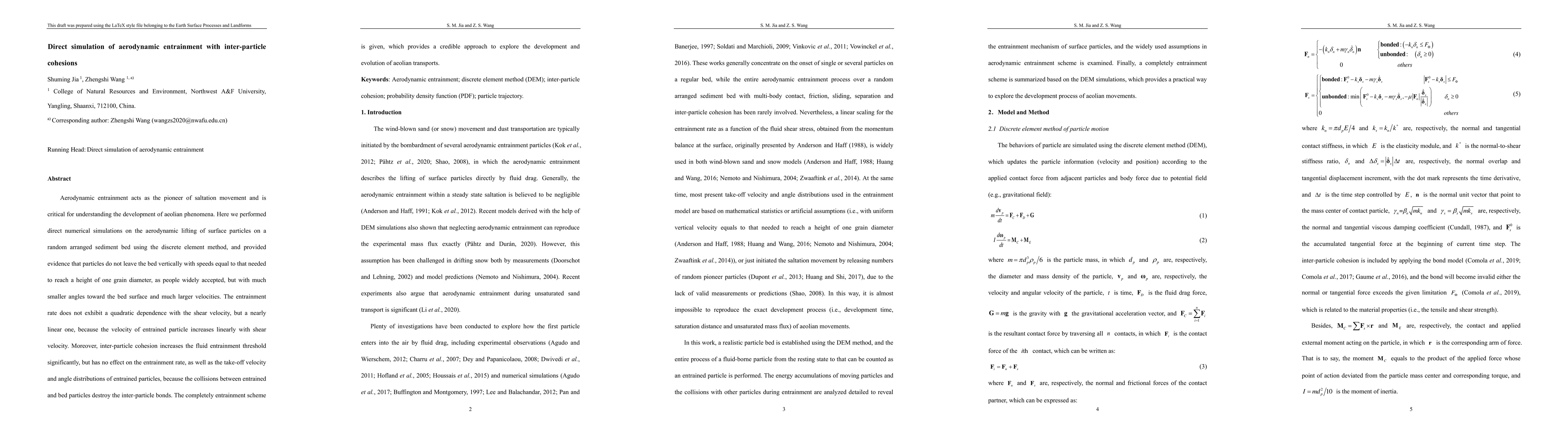 This paper uses direct numerical simulations to study aerodynamic entrainment of particles on a sediment bed, revealing that particles leave at smaller angles and higher velocities than previously thought. Inter-particle cohesion raises the entrainment threshold but does not affect the entrainment rate or particle dynamics.