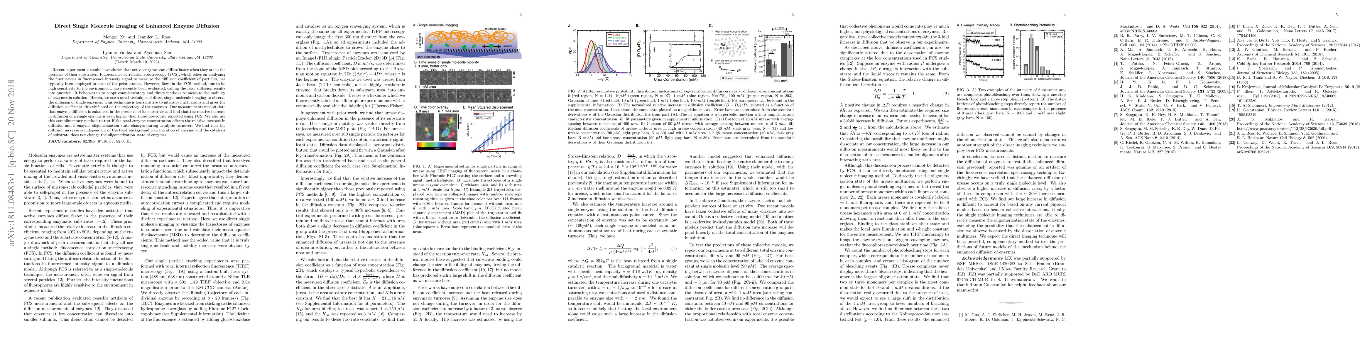 This paper uses a novel direct single-molecule imaging technique to observe enhanced enzyme diffusion in the presence of substrates, finding a higher relative increase than previous FCS-based studies. The method reveals that the diffusion enhancement is independent of total enzyme concentration and does not alter enzyme oligomerization state.