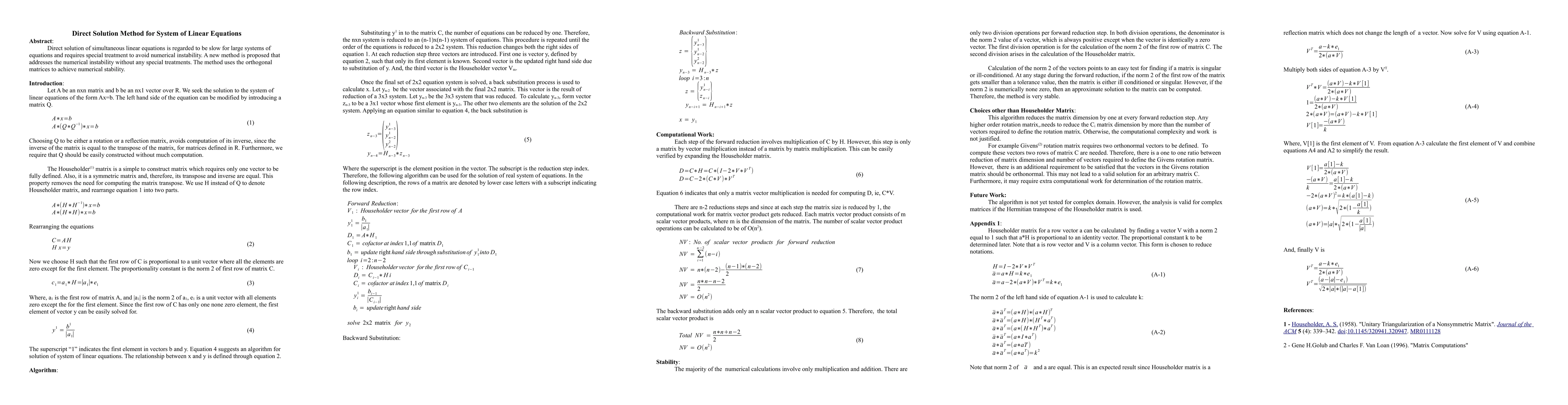 Direct solution of simultaneous linear equations is regarded to be slow for large systems of equations and requires special treatment to avoid numerical instability. A new method is proposed that addresses the numerical instability without any special treatments. The method uses the orthogonal matrices to achieve numerical stability.
