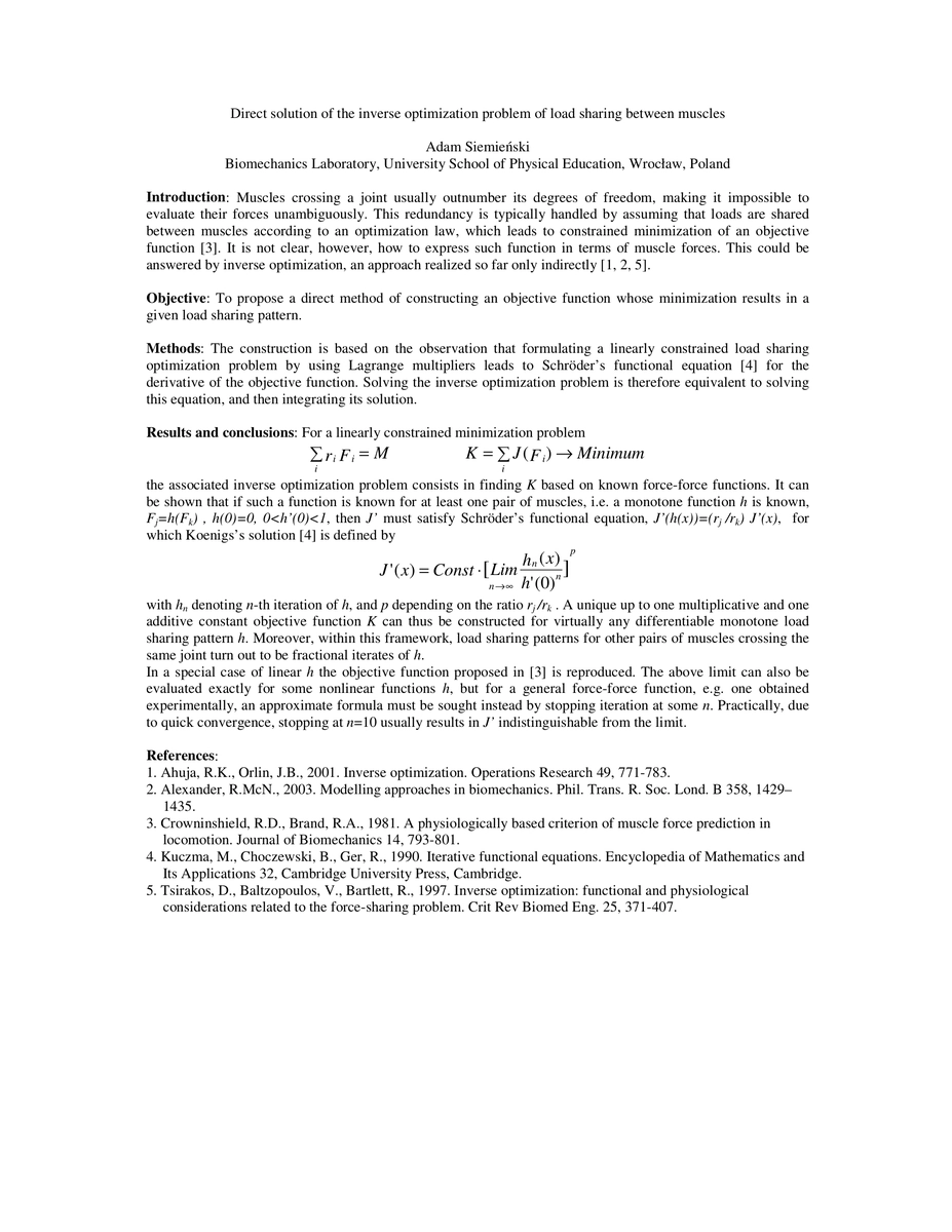In the context the statically indeterminate muscular load sharing problem considered in biomechanics of the musculoskeletal system, a method is suggested of constructing an additively separable and homogenous cost function based on a solution to a linearly constrained optimization problem involving this cost function. The construction makes use of the Koenigs solution of Schroeder's functional equation.
