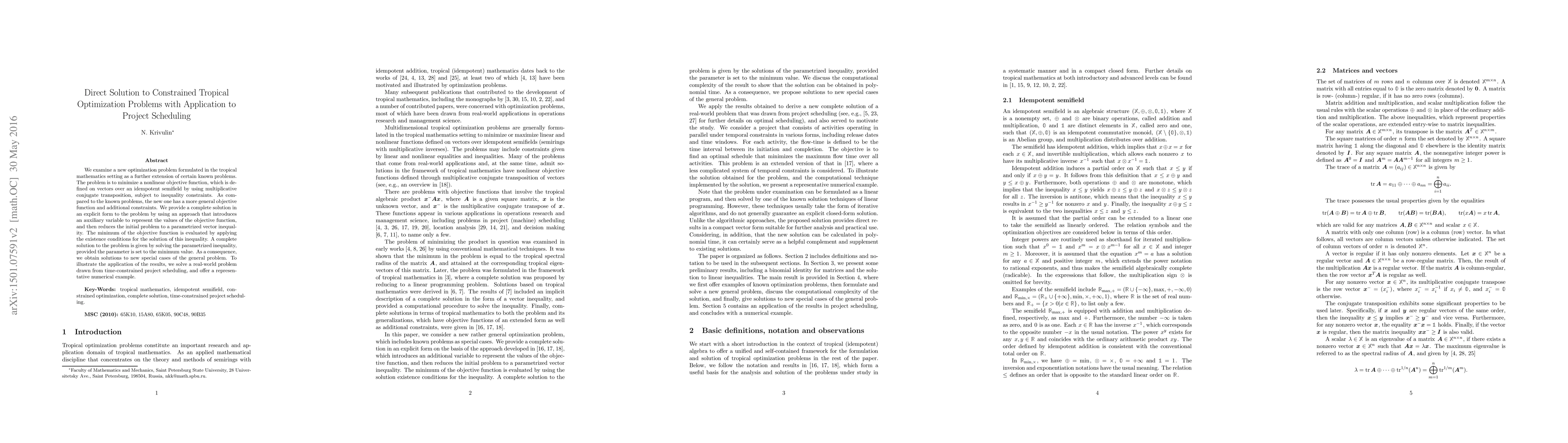 This paper presents a novel optimization problem in tropical mathematics, extending existing problems with a more general objective function and additional constraints. The authors provide an explicit solution by introducing an auxiliary variable and reducing the problem to a parametrized vector inequality, offering a complete solution through the evaluation of this inequality's minimum. An application to project scheduling is demonstrated with a numerical example.