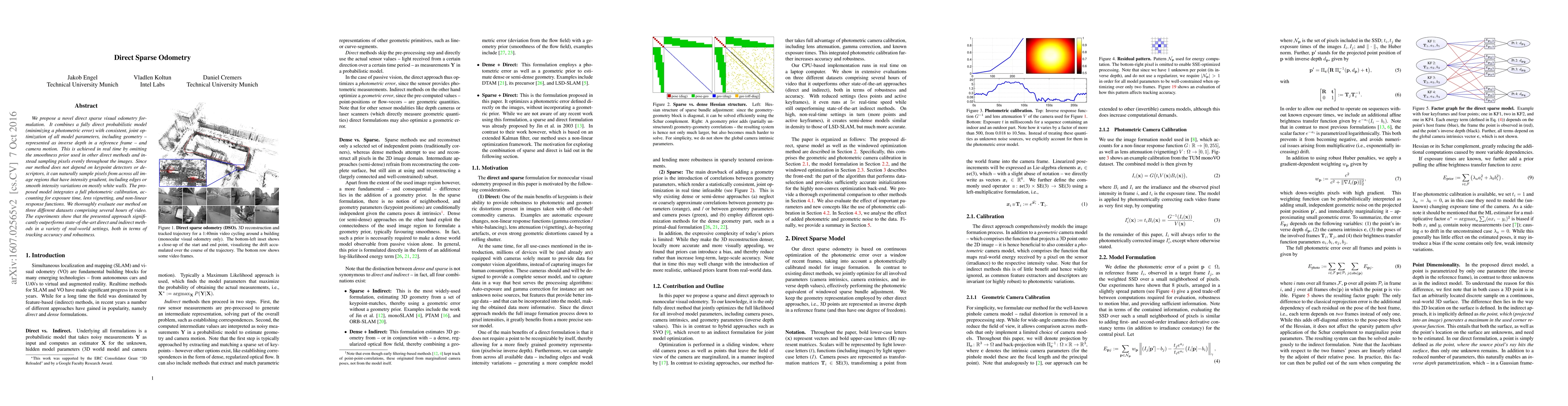 We propose a novel direct sparse visual odometry formulation. It combines a fully direct probabilistic model (minimizing a photometric error) with consistent, joint optimization of all model parameters, including geometry -- represented as inverse depth in a reference frame -- and camera motion. This is achieved in real time by omitting the smoothness prior used in other direct methods and instead sampling pixels evenly throughout the images. Since our method does not depend on keypoint detectors or descriptors, it can naturally sample pixels from across all image regions that have intensity gradient, including edges or smooth intensity variations on mostly white walls. The proposed model integrates a full photometric calibration, accounting for exposure time, lens vignetting, and non-linear response functions. We thoroughly evaluate our method on three different datasets comprising several hours of video. The experiments show that the presented approach significantly outperforms state-of-the-art direct and indirect methods in a variety of real-world settings, both in terms of tracking accuracy and robustness.