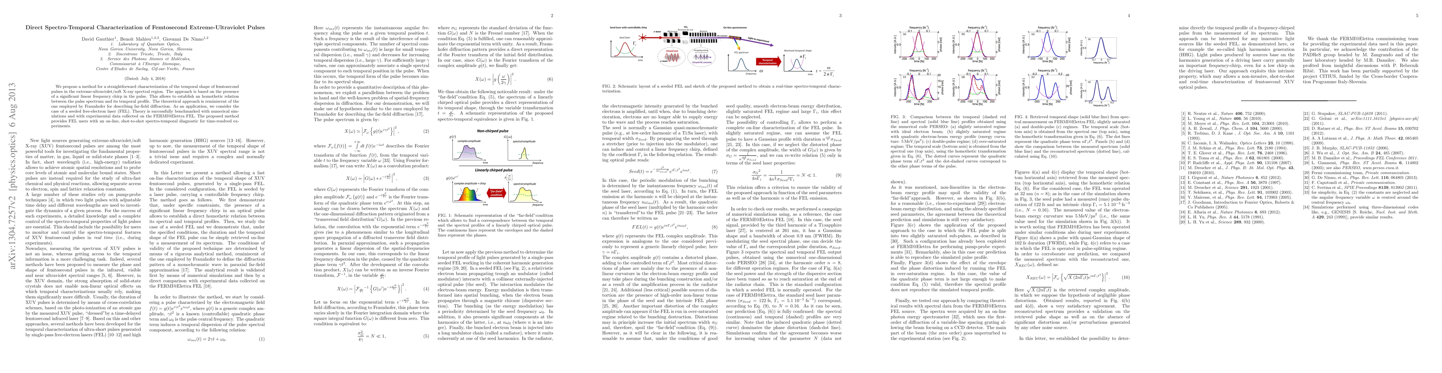 We propose a method for a straightforward characterization of the temporal shape of femtosecond pulses in the extreme-ultraviolet/soft X-ray spectral region. The approach is based on the presence of a significant linear frequency chirp in the pulse. This allows to establish an homothetic relation between the pulse spectrum and its temporal profile. The theoretical approach is reminiscent of the one employed by Fraunhofer for describing far-field diffraction. As an application, we consider the case of a seeded free-electron laser (FEL). Theory is successfully benchmarked with numerical simulations and with experimental data collected on the FERMI@Elettra FEL. The proposed method provides FEL users with an on-line, shot-to-shot spectro-temporal diagnostic for time-resolved experiments.