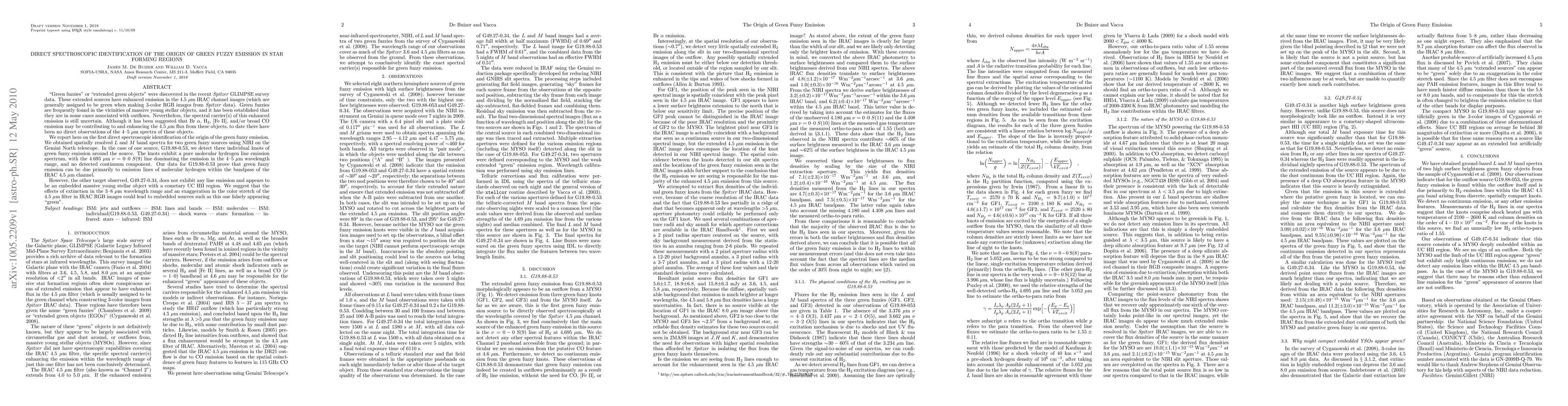 "Green fuzzies" or "extended green objects" were discovered in the recent Spitzer GLIMPSE survey data. These extended sources have enhanced emission in the 4.5um IRAC channel images (which are generally assigned to be green when making 3-color RGB images from Spitzer data). Green fuzzies are frequently found in the vicinities of massive young stellar objects, and it has been established that they are in some cases associated with outflows. Nevertheless, the spectral carrier(s) of this enhanced emission is still uncertain. Although it has been suggested that Br Alpha, H2, [Fe II], and/or broad CO emission may be contributing to and enhancing the 4.5um flux from these objects, to date there have been no direct observations of the 4-5um spectra of these objects. We report here on the first direct spectroscopic identification of the origin of the green fuzzy emission. We obtained spatially resolved L and M band spectra for two green fuzzy sources using NIRI on the Gemini North telescope. In the case of one source, G19.88-0.53, we detect three individual knots of green fuzzy emission around the source. The knots exhibit a pure molecular hydrogen line emission spectrum, with the 4.695um v=0-0 S(9) line dominating the emission in the 4-5um wavelength range, and no detected continuum component. Our data for G19.88-0.53 prove that green fuzzy emission can be due primarily to emission lines of molecular hydrogen within the bandpass of the IRAC 4.5um channel. However, the other target observed, G49.27-0.34, does not exhibit any line emission and appears to be an embedded massive young stellar object with a cometary UC HII region. We suggest that the effects of extinction in the 3-8um wavelength range and an exaggeration in the color stretch of the 4.5um filter in IRAC RGB images could lead to embedded sources such as this one falsely appearing "green".