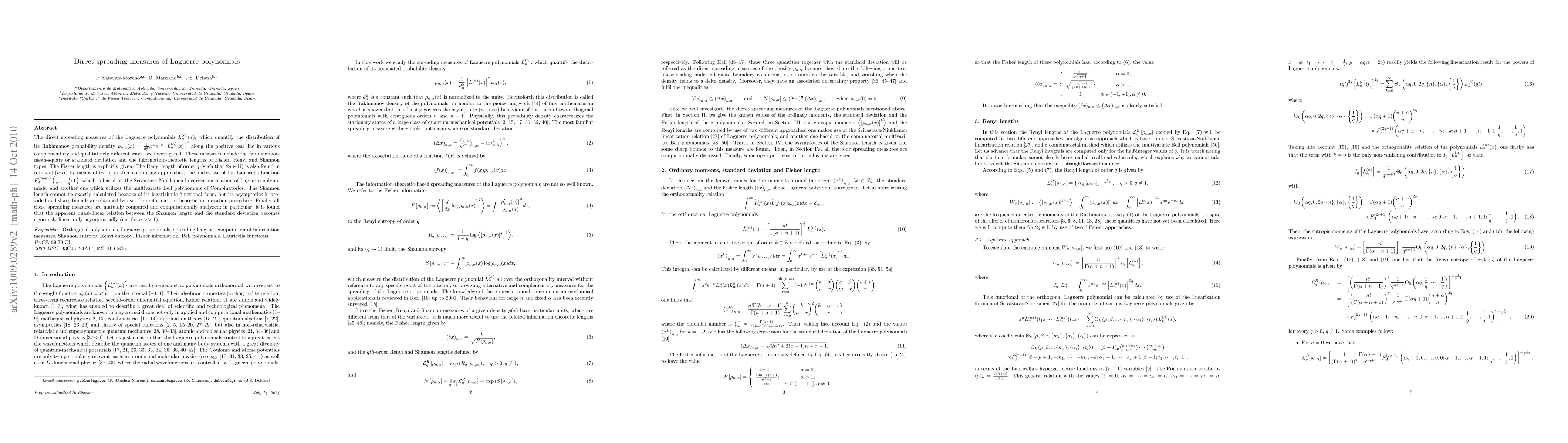 The direct spreading measures of the Laguerre polynomials, which quantify the distribution of its Rakhmanov probability density along the positive real line in various complementary and qualitatively different ways, are investigated. These measures include the familiar root-mean-square or standard deviation and the information-theoretic lengths of Fisher, Renyi and Shannon types. The Fisher length is explicitly given. The Renyi length of order q (such that 2q is a natural number) is also found in terms of the polynomials parameters by means of two error-free computing approaches; one makes use of the Lauricella functions, which is based on the Srivastava-Niukkanen linearization relation of Laguerre polynomials, and another one which utilizes the multivariate Bell polynomials of Combinatorics. The Shannon length cannot be exactly calculated because of its logarithmic-functional form, but its asymptotics is provided and sharp bounds are obtained by use of an information-theoretic optimization procedure. Finally, all these spreading measures are mutually compared and computationally analyzed; in particular, it is found that the apparent quasi-linear relation between the Shannon length and the standard deviation becomes rigorously linear only asymptotically (i.e. for n>>1).