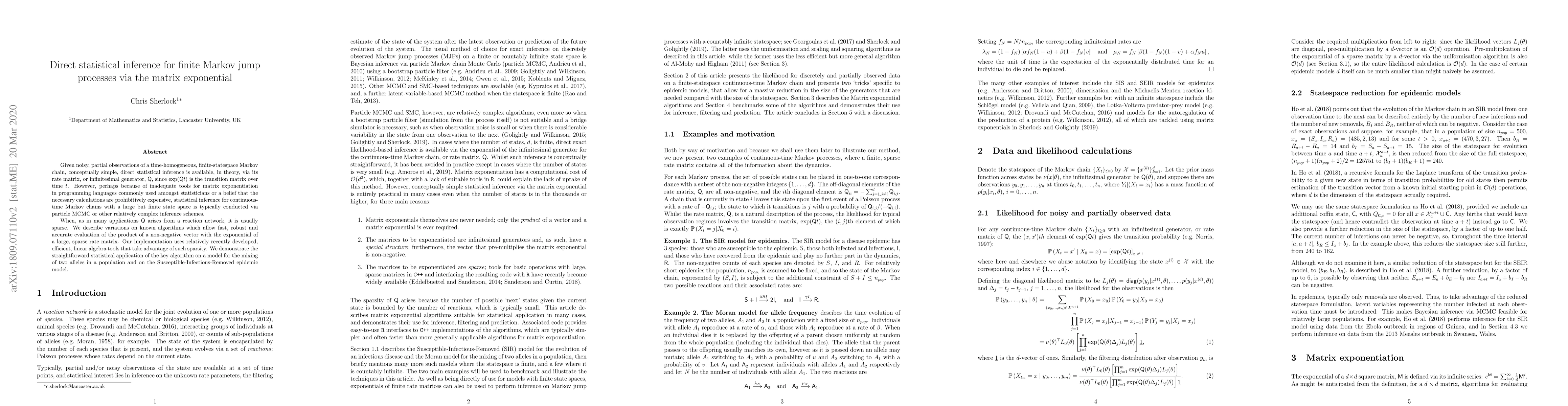 This paper proposes direct statistical inference methods for finite Markov jump processes using matrix exponentials, addressing the computational challenges of matrix exponentiation in large, sparse rate matrices. It introduces efficient algorithms leveraging modern linear algebra tools to facilitate accurate and fast inference, demonstrating applications on allele mixing and epidemic models.