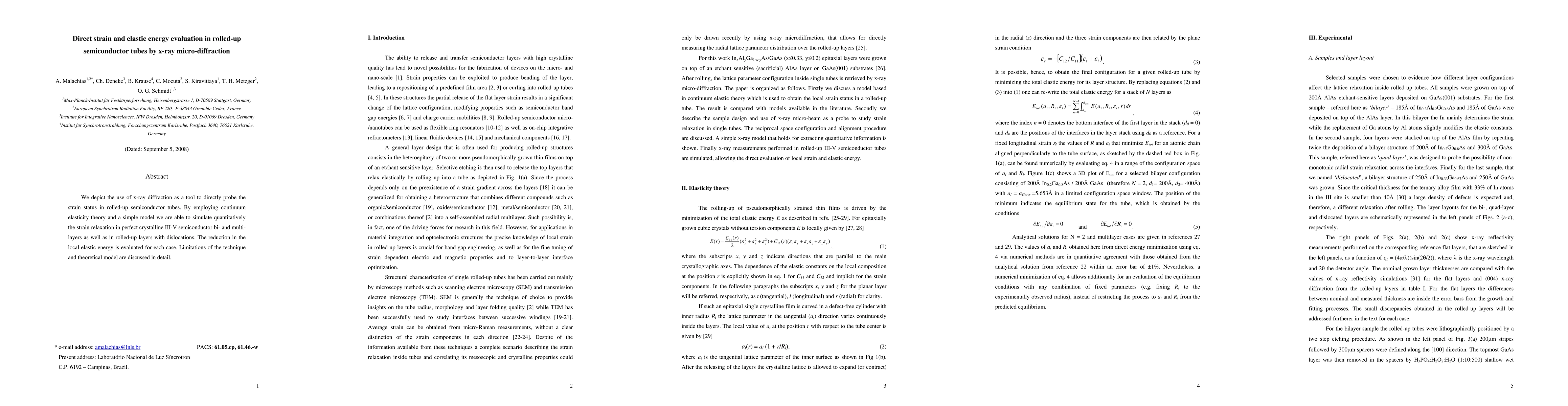 This paper utilizes x-ray micro-diffraction to directly assess strain in rolled-up semiconductor tubes, employing continuum elasticity theory to simulate strain relaxation and evaluate local elastic energy reductions, while also discussing the technique's limitations and theoretical model.