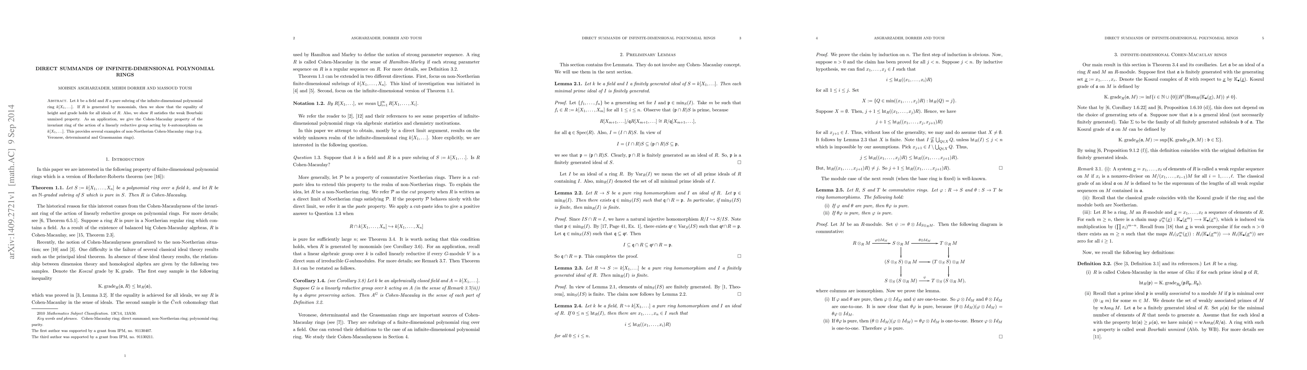 Let k be a field and R a pure subring of the infinite-dimensional polynomial ring k[X1;...]. If R is generated by monomials, then we show that the equality of height and grade holds for all ideals of R. Also, we show R satisfies the weak Bourbaki unmixed property. As an application, we give the Cohen-Macaulay property of the invariant ring of the action of a linearly reductive group acting by k-automorphism on k[X1;...]. This provides several examples of non-Noetherian Cohen-Macaulay rings (e.g. Veronese, determinantal and Grassmanian rings).