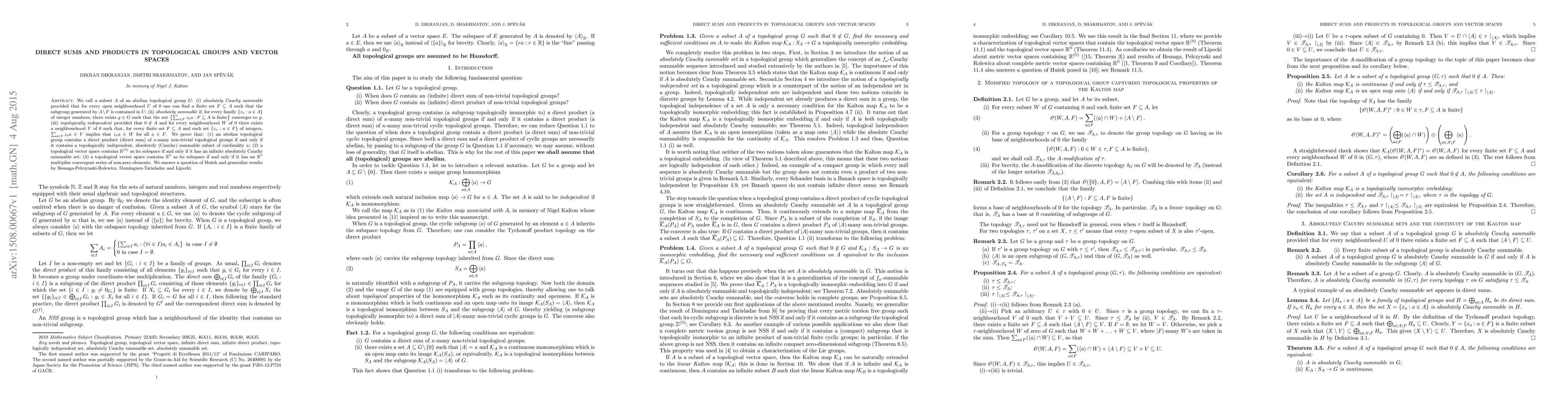 A topological group or vector space contains a specific subset if and only if it has certain summability properties, connecting direct sums and products to absolute Cauchy summability and topological independence.