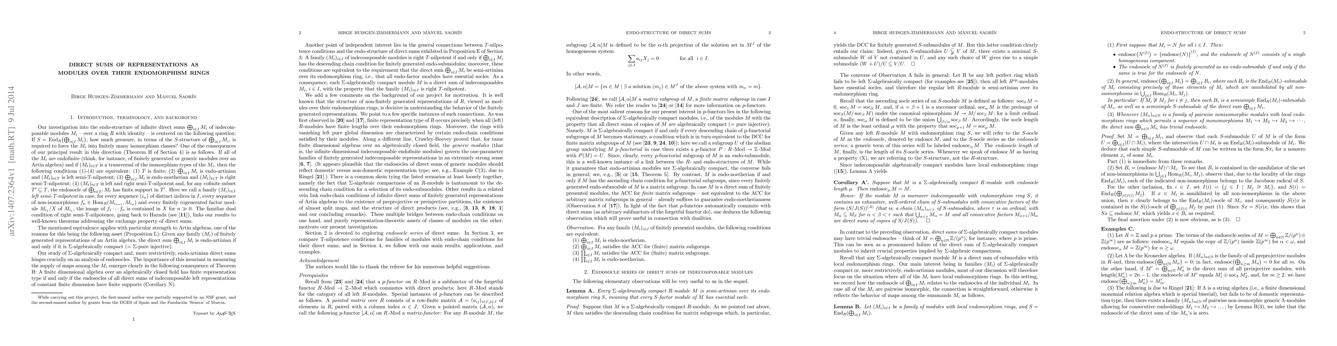 This paper is devoted to the study of the endo-structure of infinite direct sums $\bigoplus_{i \in I} M_i$ of indecomposable modules $M_i$ over a ring $R$. It is centered on the following question: If $S = \text{End}_R \bigl( \bigoplus_{i \in I} M_i \bigr)$, how much pressure, in terms of the $S$-structure of $\bigoplus_{i \in I} M_i$, is required to force the $M_i$ into finitely many isomorphism classes? In case the $M_i$ are endofinite (i.e., of finite length over their endomorphism rings), the number of isomorphism classes among the $M_i$ is finite if and only if $\bigoplus_{i \in I} M_i$ is endo-noetherian and the $M_i$ form a right $T$-nilpotent class. This is a corollary of a more general theorem in the paper which features the weaker conditions of (right or left) semi-$T$-nilpotence as well as the endosocle of a module. This result is sharpened in the case of Artin algebras, by showing that then, if the $M_i$ are finitely generated, the direct sum $\bigoplus_{i \in I} M_i$ is endo-Artinian if and only if it is $\Sigma$-algebraically compact.