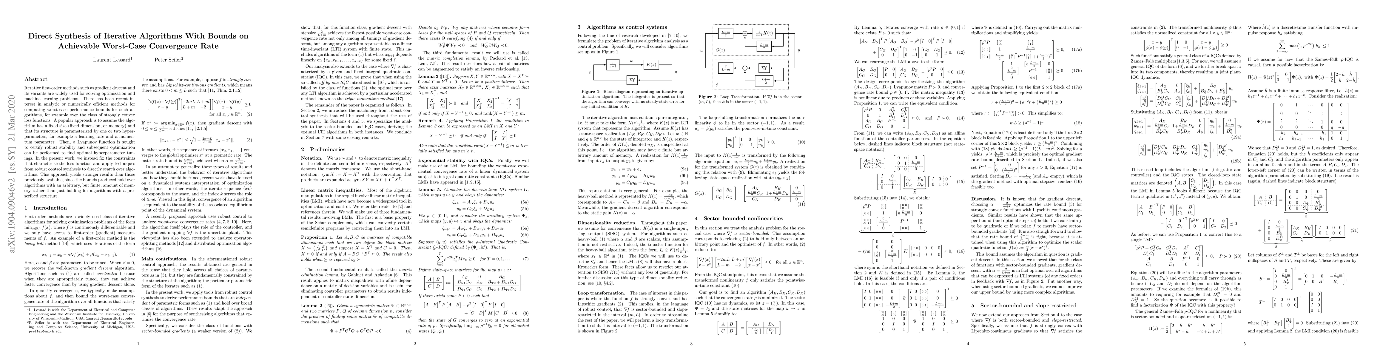 Iterative first-order methods such as gradient descent and its variants are widely used for solving optimization and machine learning problems. There has been recent interest in analytic or numerically efficient methods for computing worst-case performance bounds for such algorithms, for example over the class of strongly convex loss functions. A popular approach is to assume the algorithm has a fixed size (fixed dimension, or memory) and that its structure is parameterized by one or two hyperparameters, for example a learning rate and a momentum parameter. Then, a Lyapunov function is sought to certify robust stability and subsequent optimization can be performed to find optimal hyperparameter tunings. In the present work, we instead fix the constraints that characterize the loss function and apply techniques from robust control synthesis to directly search over algorithms. This approach yields stronger results than those previously available, since the bounds produced hold over algorithms with an arbitrary, but finite, amount of memory rather than just holding for algorithms with a prescribed structure.