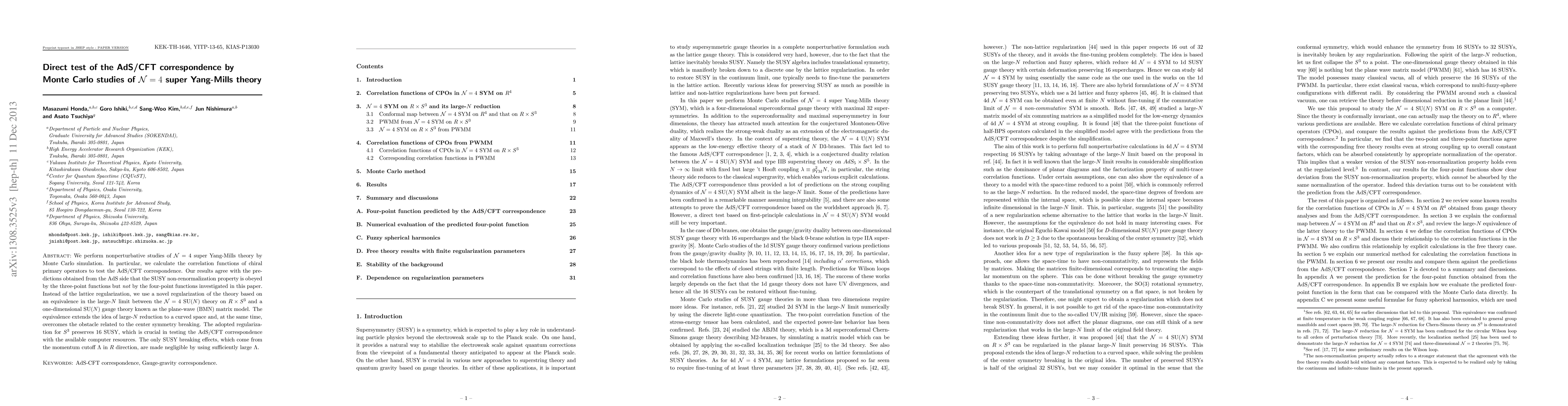 We perform nonperturbative studies of N=4 super Yang-Mills theory by Monte Carlo simulation. In particular, we calculate the correlation functions of chiral primary operators to test the AdS/CFT correspondence. Our results agree with the predictions obtained from the AdS side that the SUSY non-renormalization property is obeyed by the three-point functions but \emph{not} by the four-point functions investigated in this paper. Instead of the lattice regularization, we use a novel regularization of the theory based on an equivalence in the large-N limit between the N=4 SU(N) theory on RxS^3 and a one-dimensional SU(N) gauge theory known as the plane-wave (BMN) matrix model. The equivalence extends the idea of large-N reduction to a curved space and, at the same time, overcomes the obstacle related to the center symmetry breaking. The adopted regularization preserves 16 SUSY, which is crucial in testing the AdS/CFT correspondence with the available computer resources. The only SUSY breaking effects, which come from the momentum cutoff $\Lambda$ in R direction, are made negligible by using sufficiently large $\Lambda$.